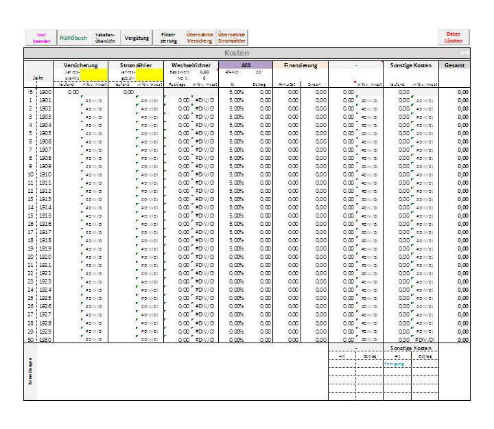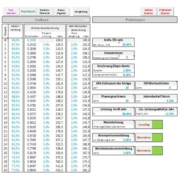 Es können bzgl. Anlagenleistung, Preisentwicklungen, Planungs-, Abschreibungszeiträume individuelle Zeiträume bis zu 30 Jahren gewählt werden. Verschiedene Kostenpositionen können individuell je Planjahr eingegeben werden. Für die Fremdfinanzierungskosten steht eine Tabelle für die Berechnung von Tilgungen und Zinsen zur Verfügung. Für die Gegenüberstellung von Leistungswerten und Bedarfswerten können in eine Tabelle Werte eingegeben werden. Sie dienen nach Inbetriebnahme der Anlage als PLAN-IST-Vergleich.