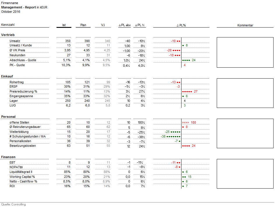 Die Abweichungen werden grafisch mit grüner und roter Farbe in Dashboard-Form hervorgehoben.