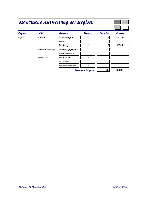 Es kann auch dazu genutzt werden, um den monatlichen Stundennachweis der Arbeitskräfte zu führen. Hierzu werden Stammdaten, wie: Mitarbeiter/Innen, Bereiche, Kostenstellen, Regionen, Stundenkostensatz etc. eingepflegt. Diese Daten stellen die Grundlage für die tägliche Zuordnung der Mitarbeiter zu den einzelnen Kostenstellen bzw. Bereichen, dar.