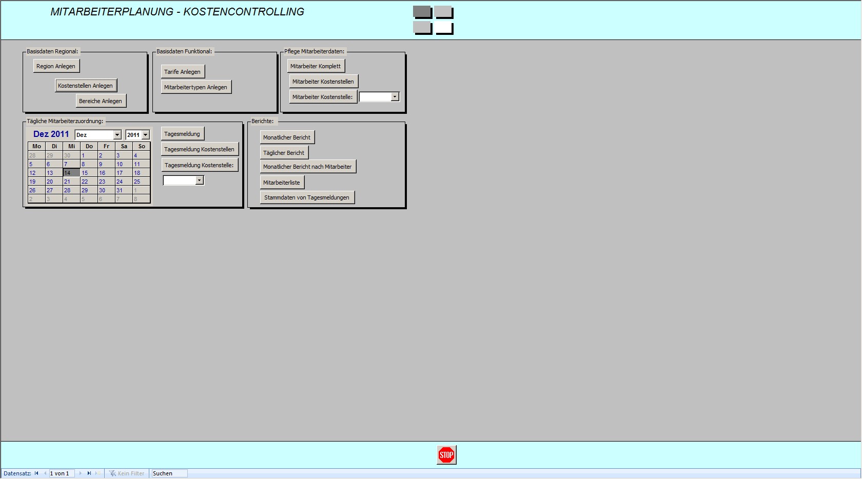 Programm zur Erfassung und täglichen Zuordnung von Mitarbeitern für ein exaktes Kostenstellenbasiertes Kostencontrolling. Mit dieser Datenbank ist es Ihnen möglich, Ihre Mitarbeiter/Innen taggenau ihren Tätigkeiten zuzuordnen und somit ein operatives Personalkostencontrolling zu ermöglichen.