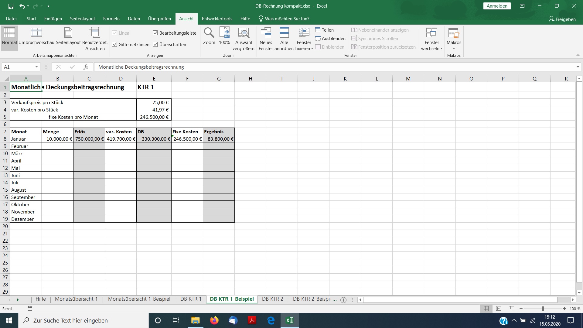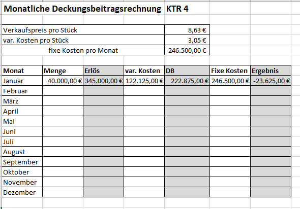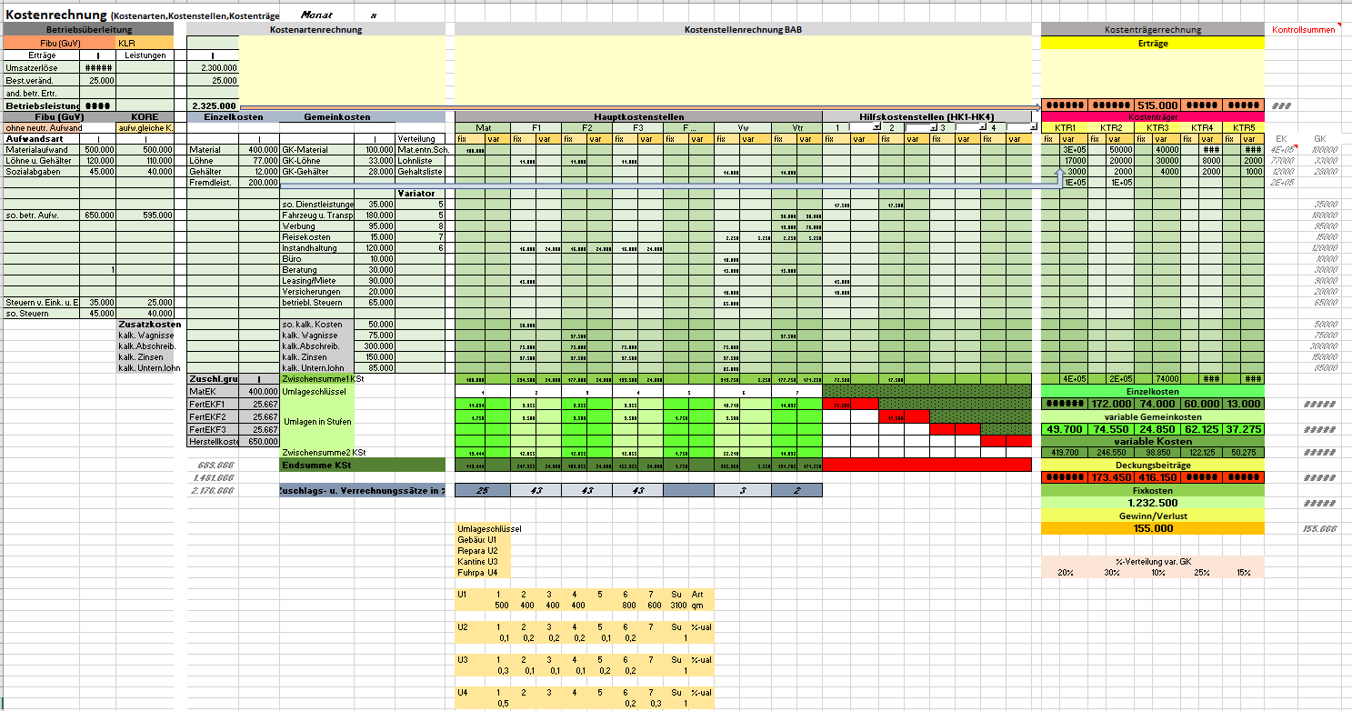 In den Tabellenblättern DB KTR X werden pro Kostenträger über die Absatzmenge, den Verkaufspreis und die variablen Stückkosten die monatlichen Erlöse und Deckungsbeiträge ermittelt. Die Tabellenblätter Monatsübersicht X beinhalten über die Stufen Kostenartenrechnung, Kostenstellenrechnung und Kostenträgerrechnung die Verteilung der angefallenen Kosten auf die Kostenstellen und die Zuordnung auf die Kostenträger. Hierbei kommt der Trennung der Kosten in Einzelkosten sowie variablen und fixen Gemeinkosten eine besondere Rolle zu. Das Ergebnis sind kostenträgerbezogene Deckungsbeiträge, die in Summe zur Deckung der fixen Kosten ausreichen sollten,
