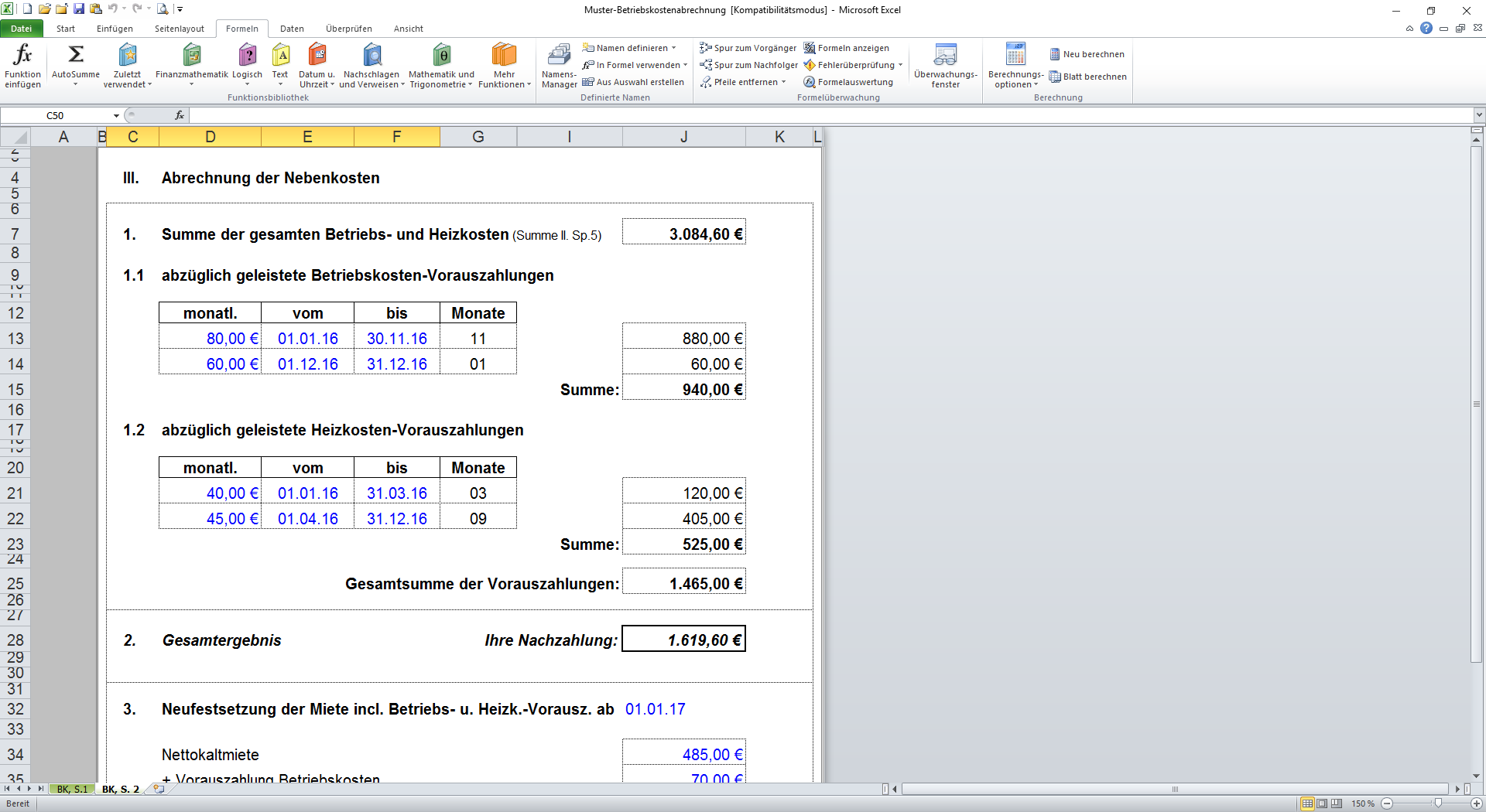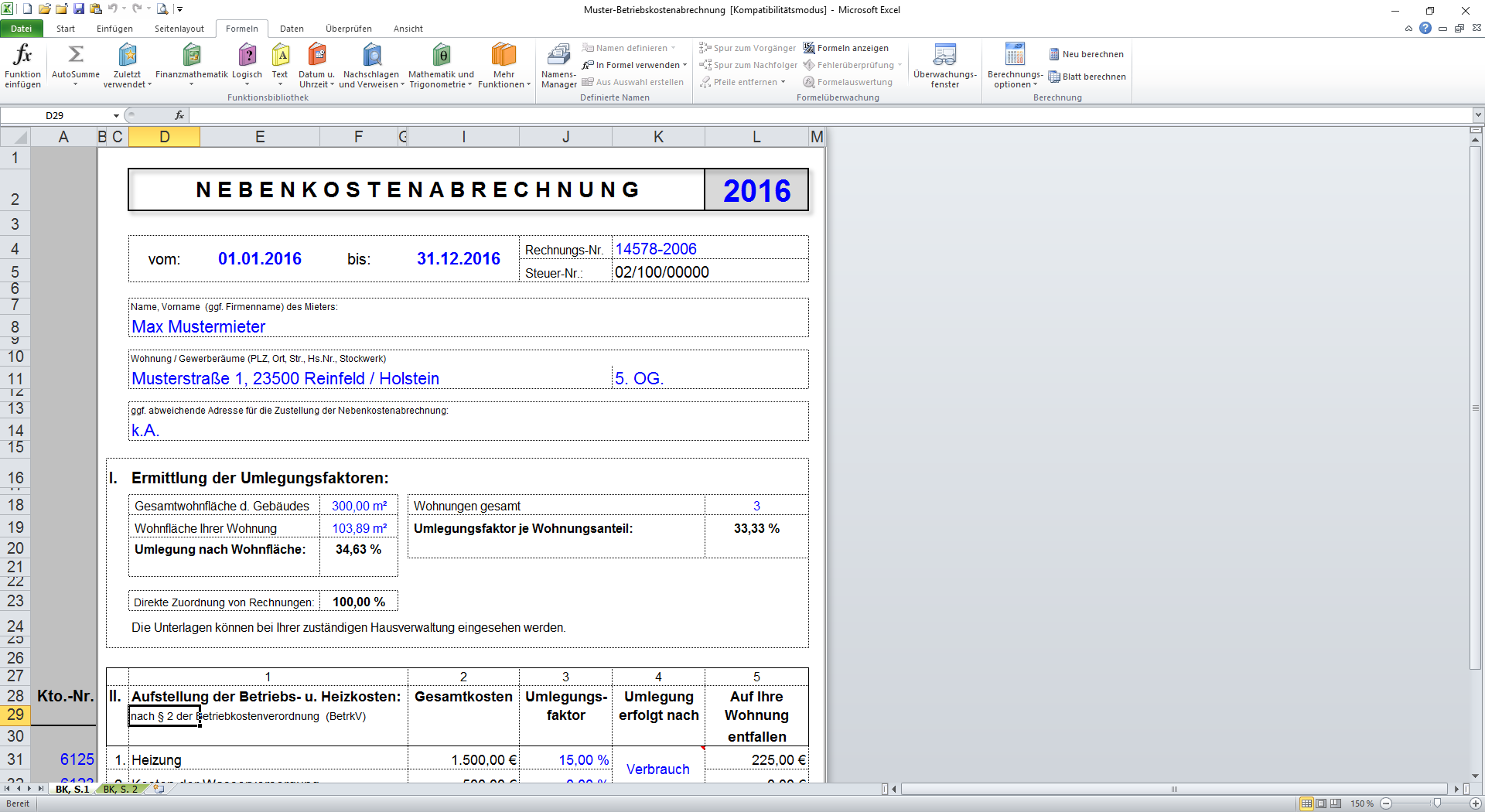 Muster-Betriebskostenabrechnung in Excel. Hier können Sie Ihre Betriebskosten-Abrechnungen nach Erhalt durch Ihren Vermieter selbst abstimmen oder als Vermieter gar selbst nach § 2 der Betriebkostenverordnung (BetrkV) erstellen.