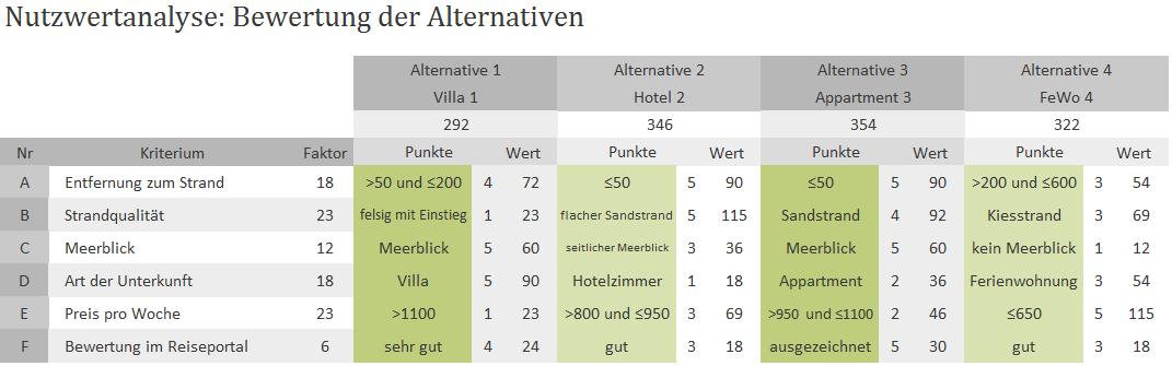 Die Nutzwertanalyse ist eine Methode zur quantitativen Bewertung des Nutzens von Entscheidungsalternativen, die wegen fehlender numerischer oder monetärer Vergleichskriterien nicht oder schwer miteinander vergleichbar sind. Dieses Excel Tool ermöglicht die Durchführung einer Nutzwertanalyse für bis zu fünf Alternativen nach bis zu zwölf, nicht hierarchischen Kriterien.