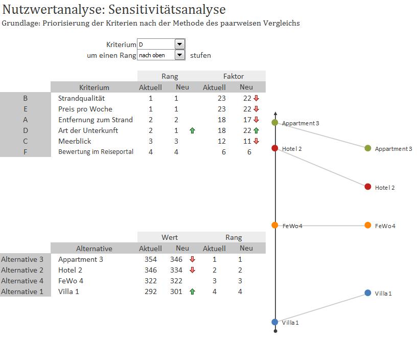 Mit Hilfe einer eingebauten automatisierten Sensitivitätsanalyse kann untersucht werden, inwiefern sich geringfügige Änderungen in der Gewichtung der Kriterien auf das Ergebnis auswirken.