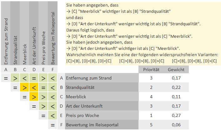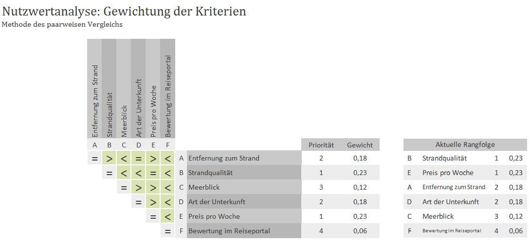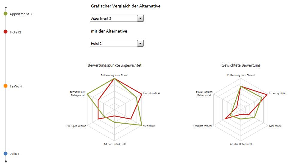 Als Besonderheit ist eine Plausibilitätsprüfung integriert, die Widersprüche beim paarweisen Vergleich der Kriterien aufspürt und Korrekturvorschläge anbietet. Das Ergebnis der Nutzwertanalyse wird in einer Grafik dargestellt, die die Rangfolge der Alternativen anschaulich verdeutlicht.
