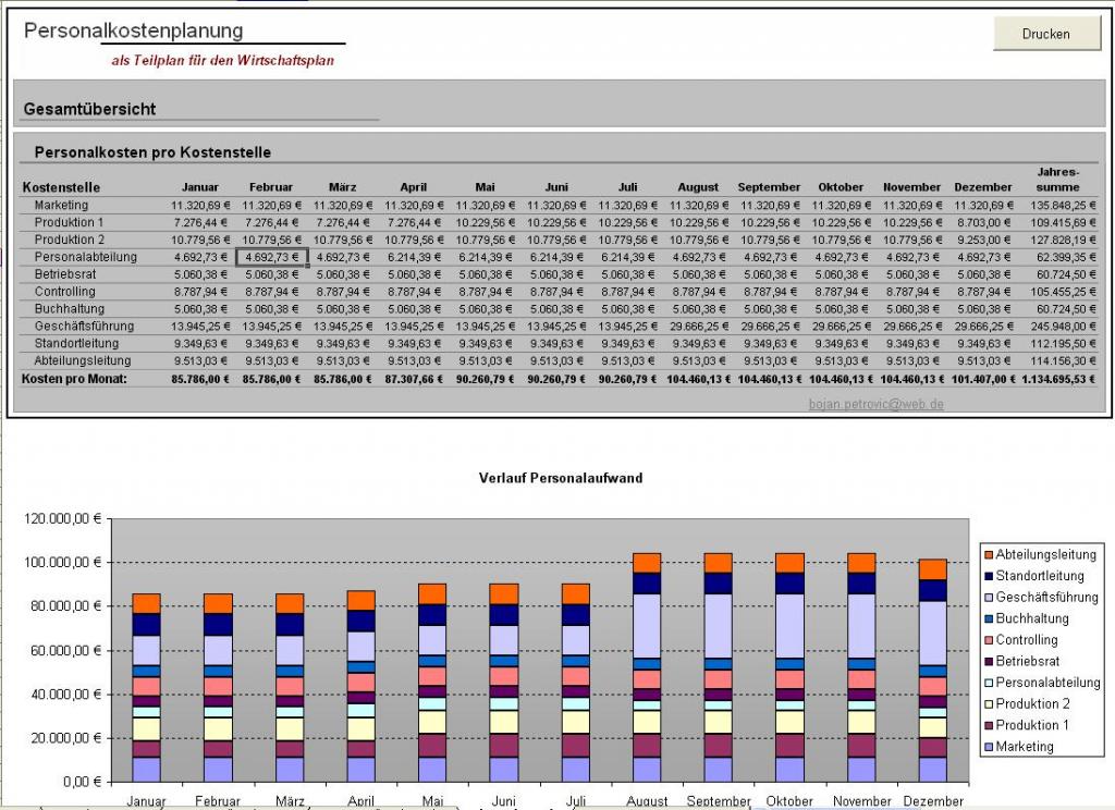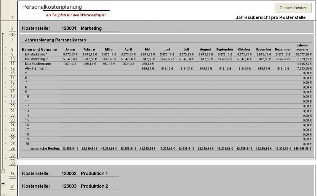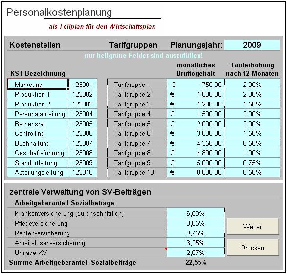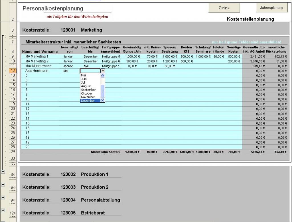 Das Excel-Tool "Personalkostenplanung auf Kostenstellenbasis" ermöglicht Ihnen eine branchenunabhängige monatliche und jährliche Personalkostenplanung und eignet sich ebenfalls als Teilplan für den Wirtschaftsplan mit folgenden Eigenschaften: