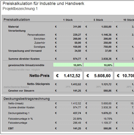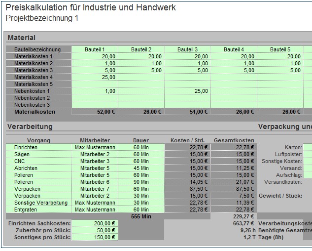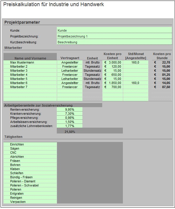 Kalkulieren Sie Ihre Preise für Ihren Handwerks- oder kleinen Industriebetrieb mit dieser auf MS Excel basierenden Vorlage. Es ist bietet Ihnen folgende Möglichkeiten an: