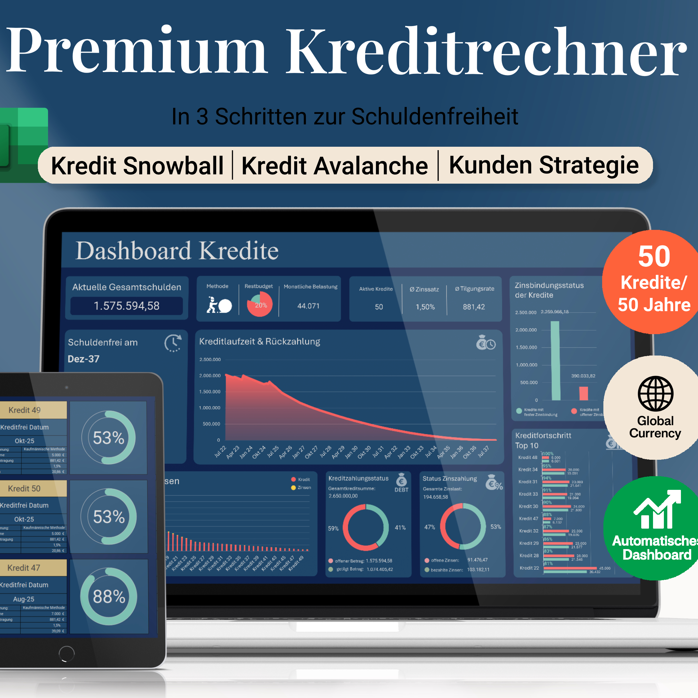 Mit diesem Kreditrechner für Excel hast du deine gesamte Schuldenlage im Griff – einfach, übersichtlich und effektiv. Spare bares Geld durch bessere Planung. Dieser Planer wurde speziell dafür entwickelt, auch bei komplexen Kreditstrukturen Übersicht und Kontrolle zu behalten.