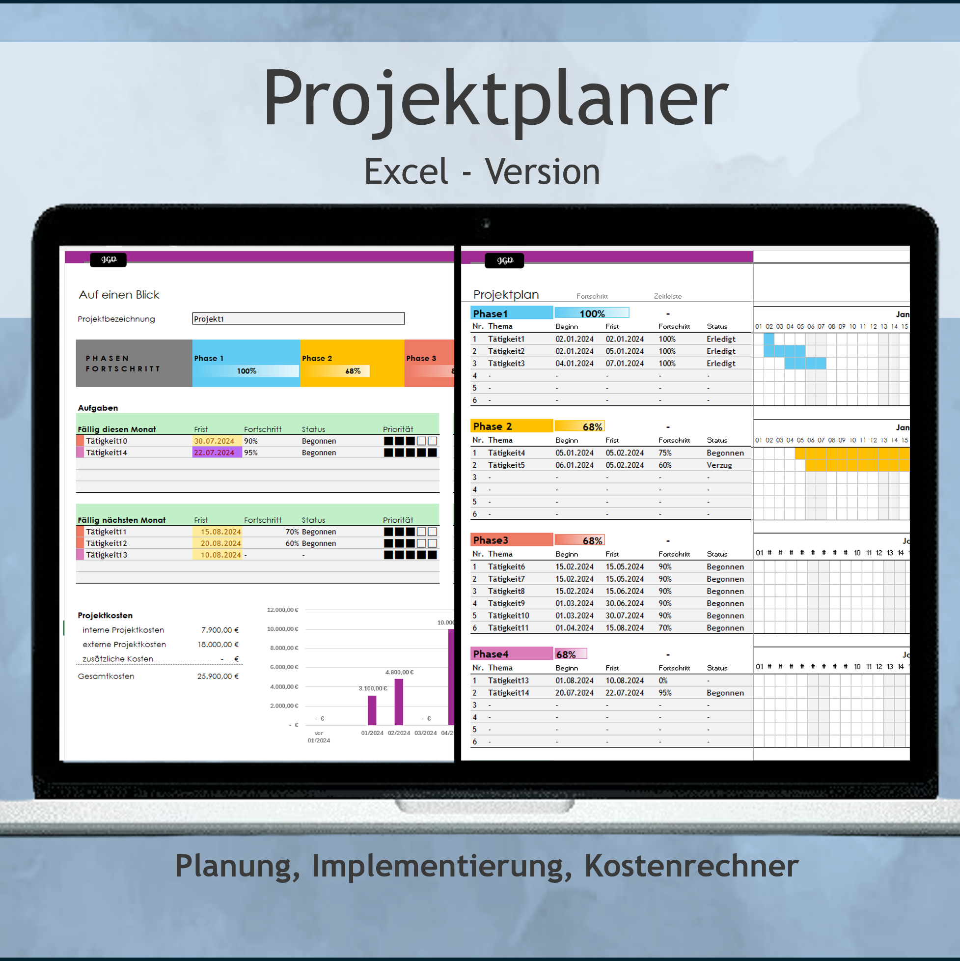 Starten Sie die Realisierung von Projekten und Investitionen. Der Projektplaner in Excel begleitet Sie durch den gesamten Planungs- und Realisierungsprozess. Von der ersten Idee, zur Feinplanung bis hin zur Implementierung und Nachbearbeitung; der Projektplaner hilft Ihnen die Planungsstufen und Kosten im Blick zu behalten, zeigt Ihnen aktuelle Deadlines auf, informiert Sie stets über den Fortschritt und die Einhaltung der Zeitstruktur.
