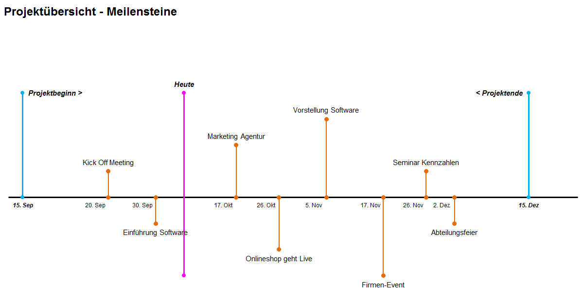 Sie geben lediglich das Start- und Enddatum sowie die jeweiligen Meilensteine zum entsprechenden Datum ein. Alles andere übernimmt Excel für Sie.