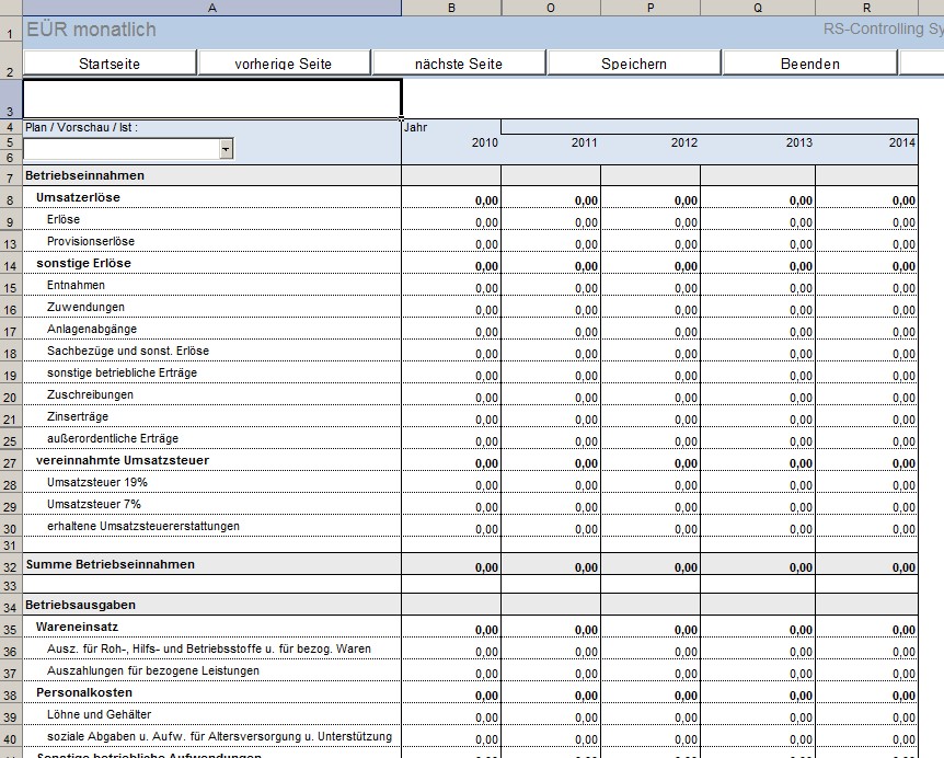 Das System bietet zusätzlich verschiedene Auswertungsmöglichkeiten wie zum Beispiel eine Einnahmen-Überschuss-Rechnung auf Monatsbasis oder die wichtigsten Kennzahlen für ihr Unternehmen in einem Bericht. Zusätzlich bietet dieses Tool eine Import-Tabelle zur Erfassung der IST- Daten. Durch die Anzeige der drei wichtigsten Kenngrößen Umsatz, liquide Mittel und Jahresüberschuss zum aktuellen Monat auf der Startseite, haben Sie sofort alle wichtigen Größen im Überblick.