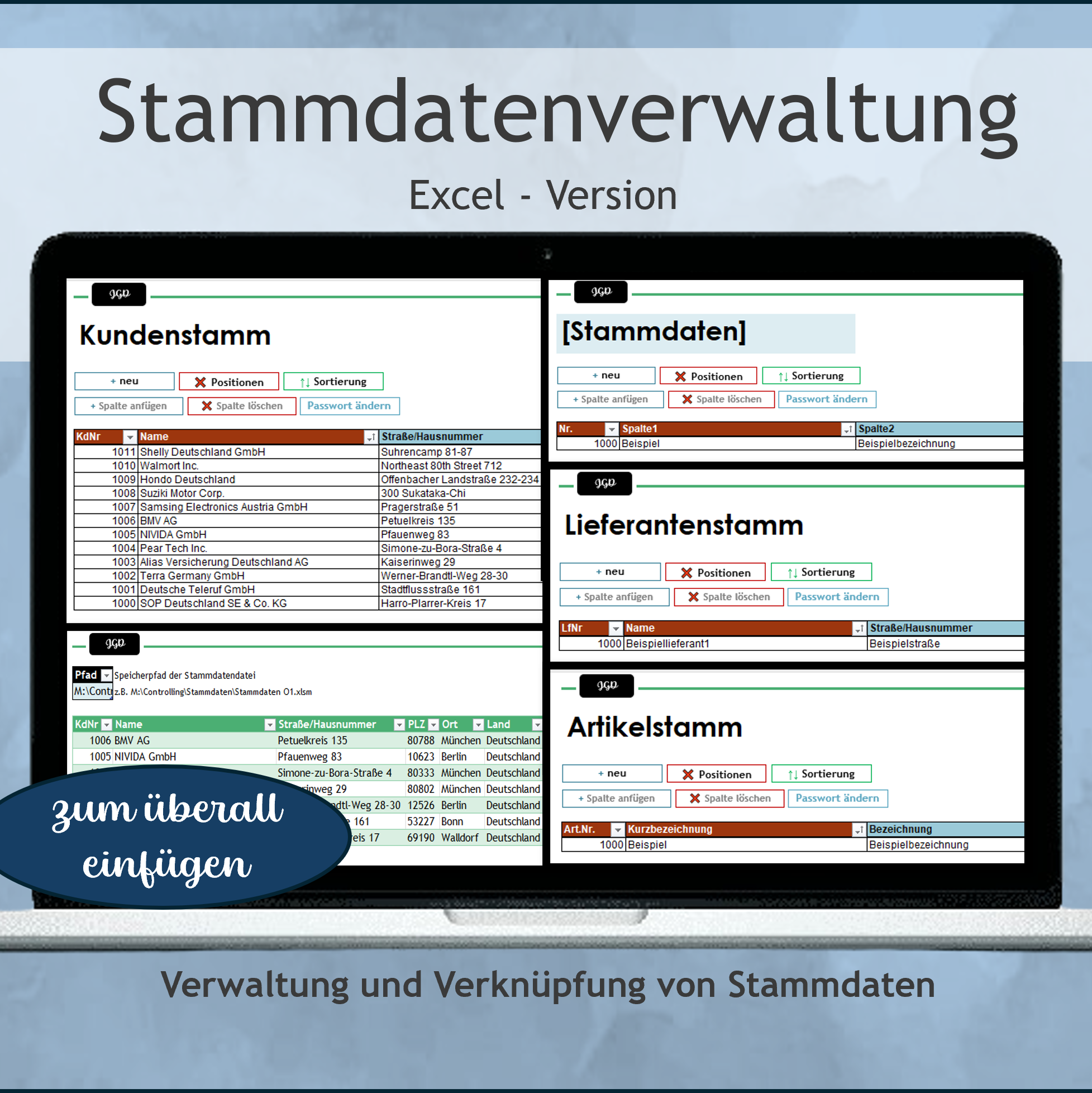 Stammdatenverwaltung in Excel: Die Datei umfasst drei Tabellen für Kunden-, Artikel- und Lieferantenstammdaten, sowie eine Tabelle für zusätzliche selbst definierte Stammdaten. Für jede Tabelle gibt es ein Arbeitsblatt, das jeweils so verknüpft ist, dass es von Ihnen in jede beliebige Datei geladen werden kann und Sie immer mit einem Klick die aktuellen Stammdaten laden können.