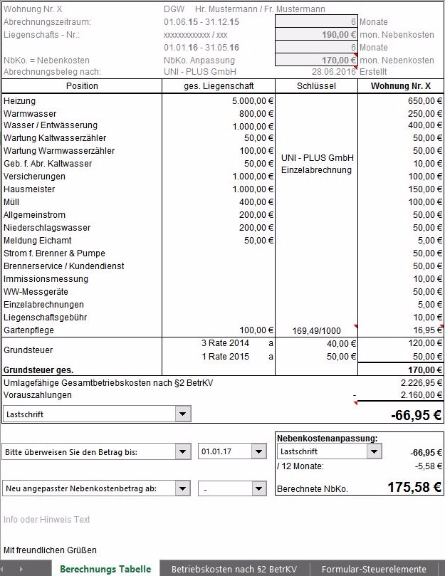 In der Haupttabelle werden die auf den Mieter umlegbaren Betriebskosten eingetragen. Hierzu findet man in der Mappe „Betriebskosten §2 BetrKV eine tabellarische Arbeitshilfe, die Ihnen beim Ausfüllen der Haupttabelle Hilfreich sein kann.
