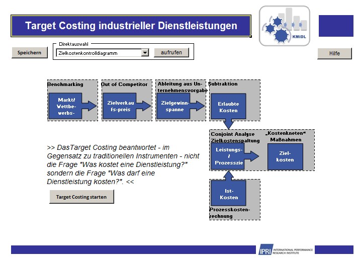 Diese MS Excel-Tool für Target Costing wurde insbesondere für die industriellen Dienstleistungen der Branche Antriebstechnik optimiert. Insbesondere wird hierbei auf eine Unterstützung von kleinen- und mittelständischen Unternehmen abgestellt. Darüber hinaus ist eine Anpassung der zu Grunde liegenden Konzeption auf sämtliche Dienstleistungsbereiche ohne größeren Anpassungsaufwand denkbar.