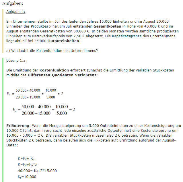 Erläuterung: Wenn die Mengensteigerung um 5.000 Outputeinheiten zu einer Kostensteigerung um 10.000 € führt, dann verursacht jede einzelne zusätzliche Outputeinheit eine Kostensteigerung um 10.000 / 5.000 = 2 €. Die variablen Stückkosten müssen also 2 € betragen. Wenn die variablen Stückkosten 2 € betragen, dann belaufen sich die Fixkosten auf: Ermittlung aufgrund der August-Daten: