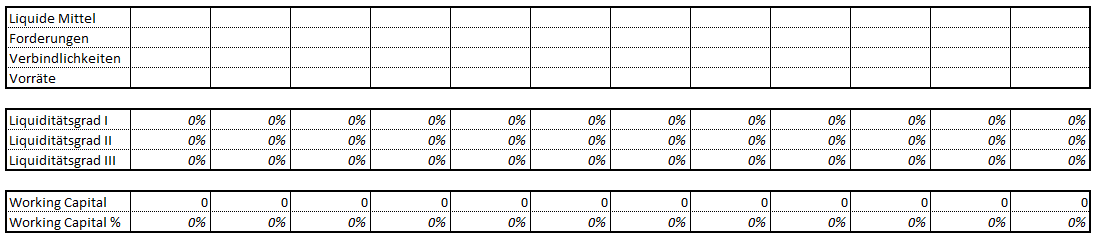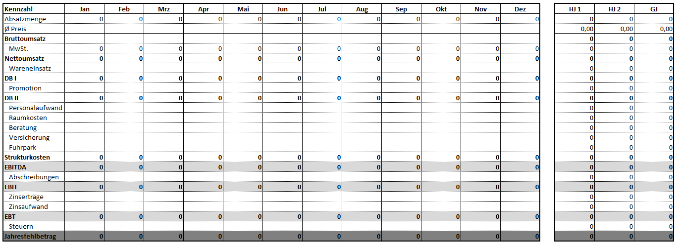 In diesem einfachen Excel Tool für Unternehmensplanung werden die monatlichen Kennzahlen einer BWA geplant. Nach der Eingabe von Umsatz- und Kosten auf Monatsbasis werden diese Daten zusätzlich auf einem Extra Tabellenblatt in dieser Vorlage kumuliert zusammengefasst. Vom Ø Verkaufspreis, über den Umsatz bis zum Jahresüberschuss, oder Fehlbetrag. Auch die Liquiditätsgrade und das Working Capital finden sich in dieser Planung wieder.