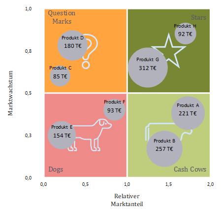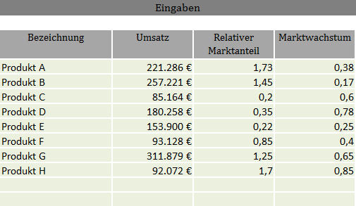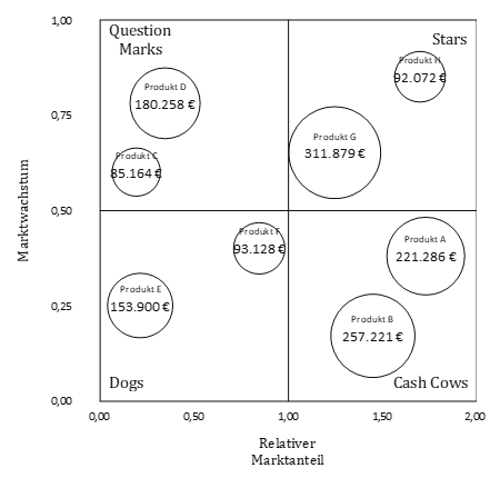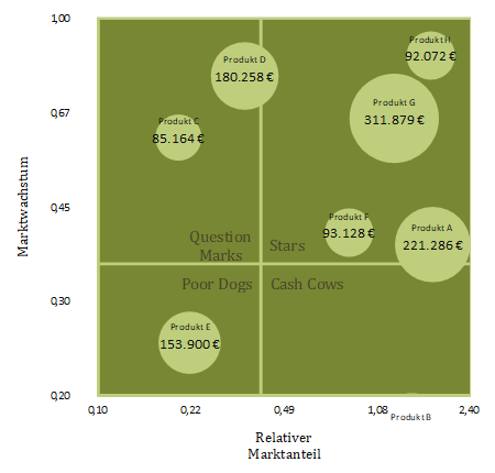 Diese Excel-Vorlage ermöglicht das Erstellen einer Portfoliomatrix nach dem Muster der Boston Consulting Group (auch Vier-Felder-Matrix, Growth-Share-Matrix oder BCG-Matrix). In einem Koordinatensystem aus Relativem Marktanteil und Marktwachstum werden die zu analysierenden Produkte als Kreise eingetragen, wobei die Kreisflächen proportional zum Umsatz sind.