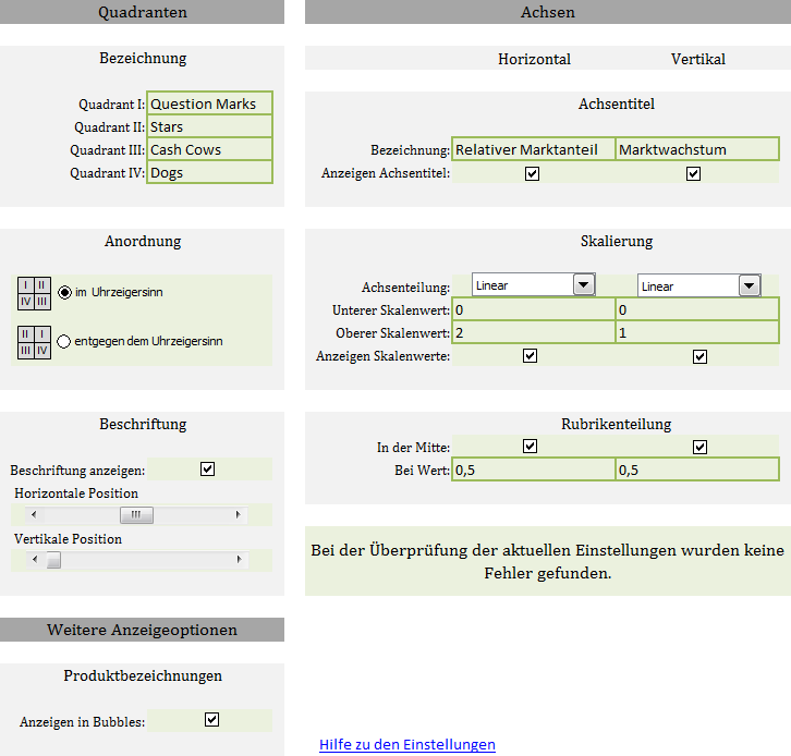 - Skalierung der Achsen (Standard: Relativer Marktanteil - von 0 bis 1, Marktwachstum - von 0 bis 2)