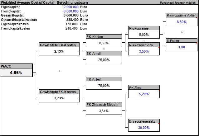 Der Berechnungsbaum hat den Vorteil, dass man sofort erkennen kann, woher die Zahlen kommen und wie sich der WACC zusammensetzt. Alternativ besteht die Möglichkeit, den WACC mit einer „klassischen“ Berechnungshilfe zu ermitteln. Alle Eingaben und Ergebnisse entsprechen denen des Berechnungsbaums.