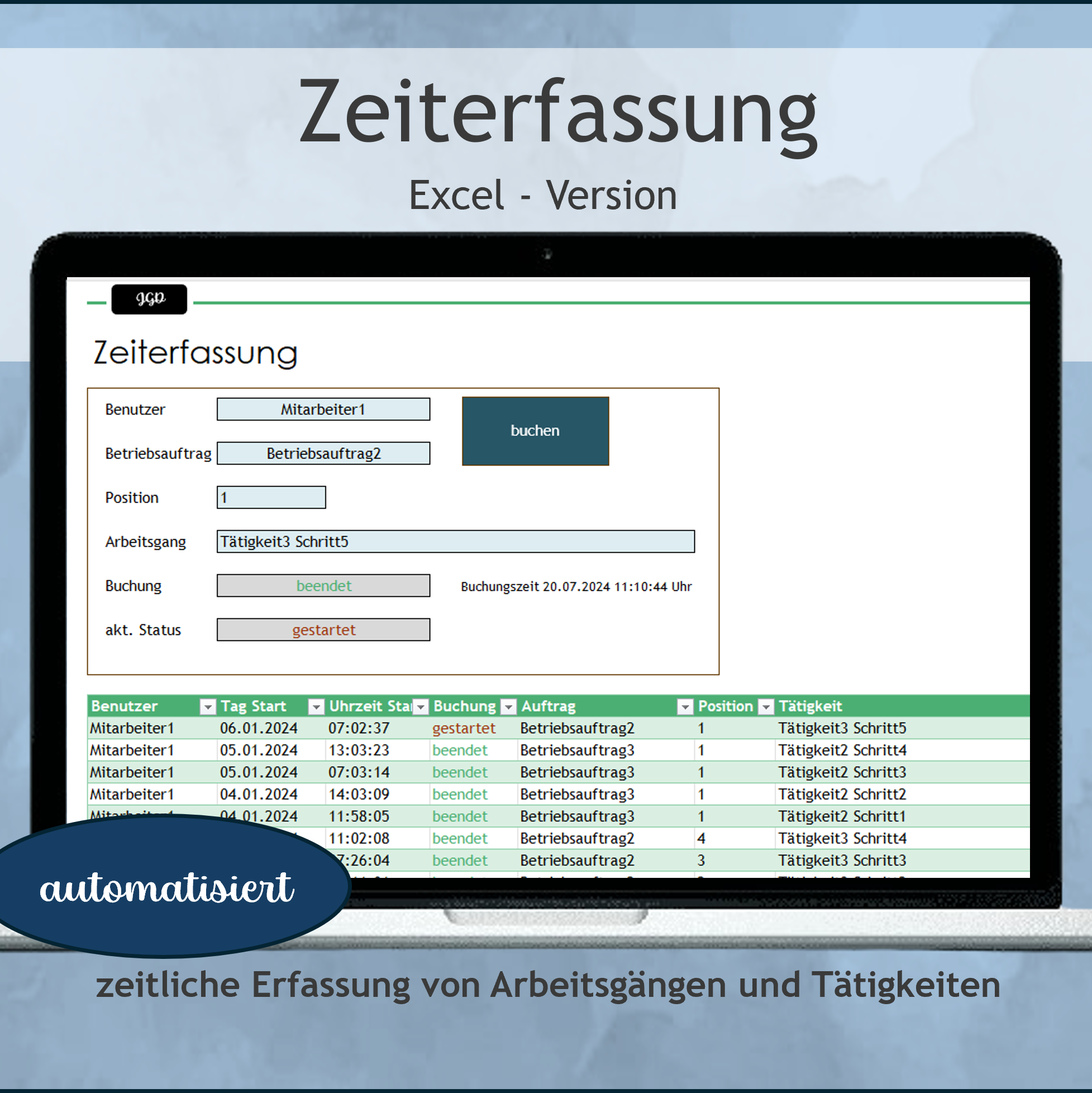 Automatisierte Zeiterfassung: Erfassen Sie Arbeitsgänge, Tätigkeiten, Abläufe und vieles mehr. Mithilfe dieser Datei können Sie zeitliche Abläufe aller Art in Ihrem Unternehmen messen. Ob zur Ermittlung von Planzeiten, Soll- / Istabgleichen, für die Preiskalkulation oder zur Weiterentwicklung von Kennzahlen.