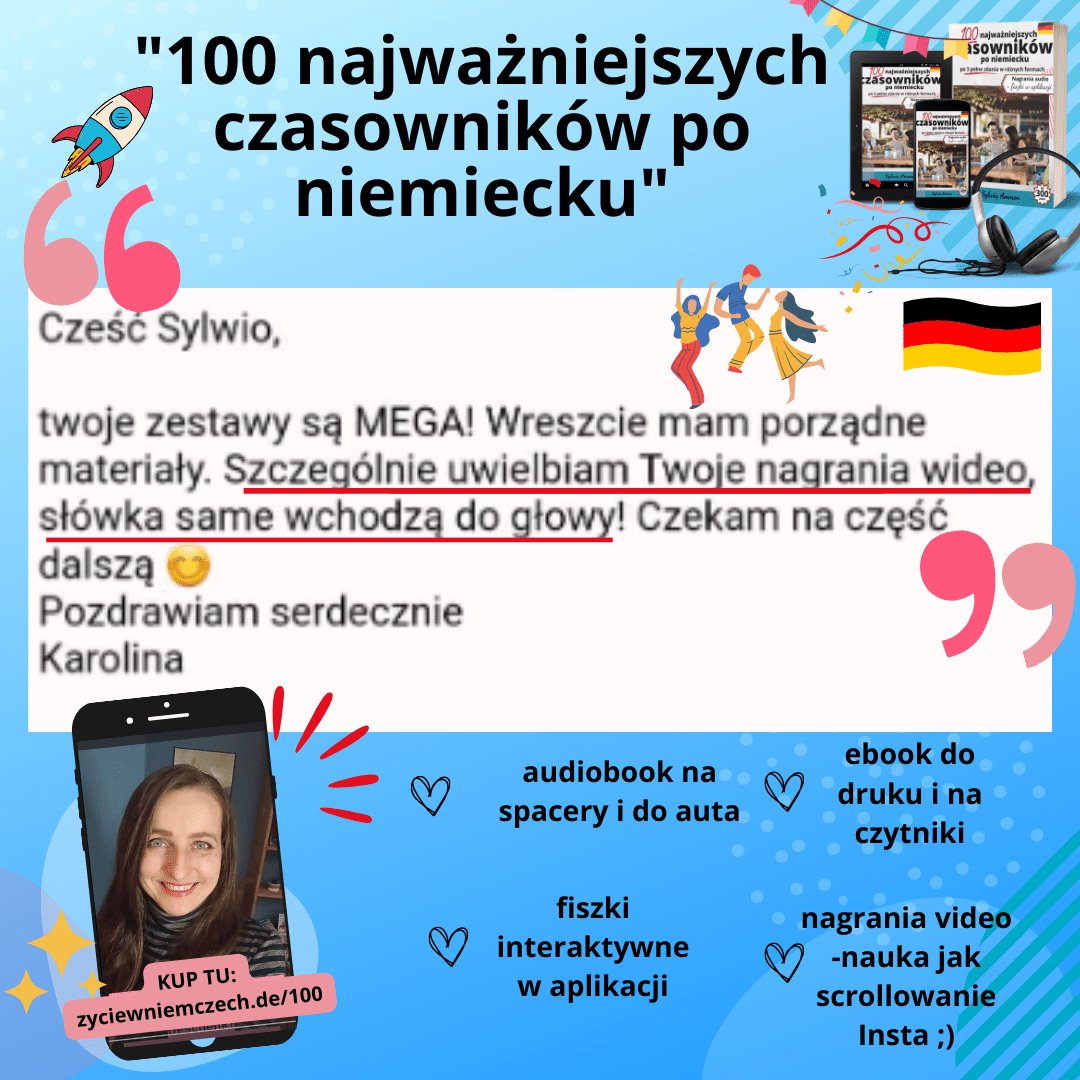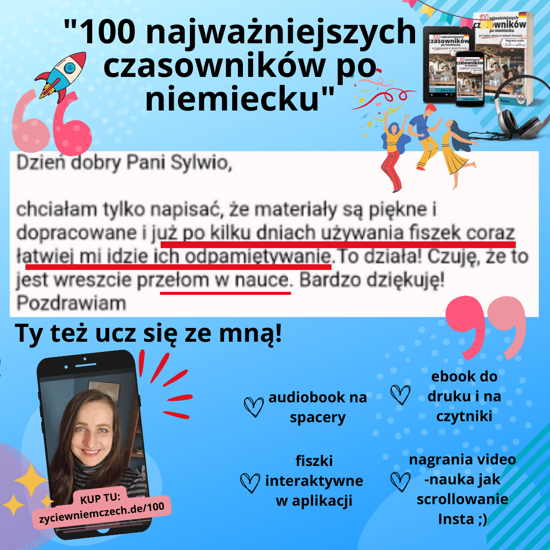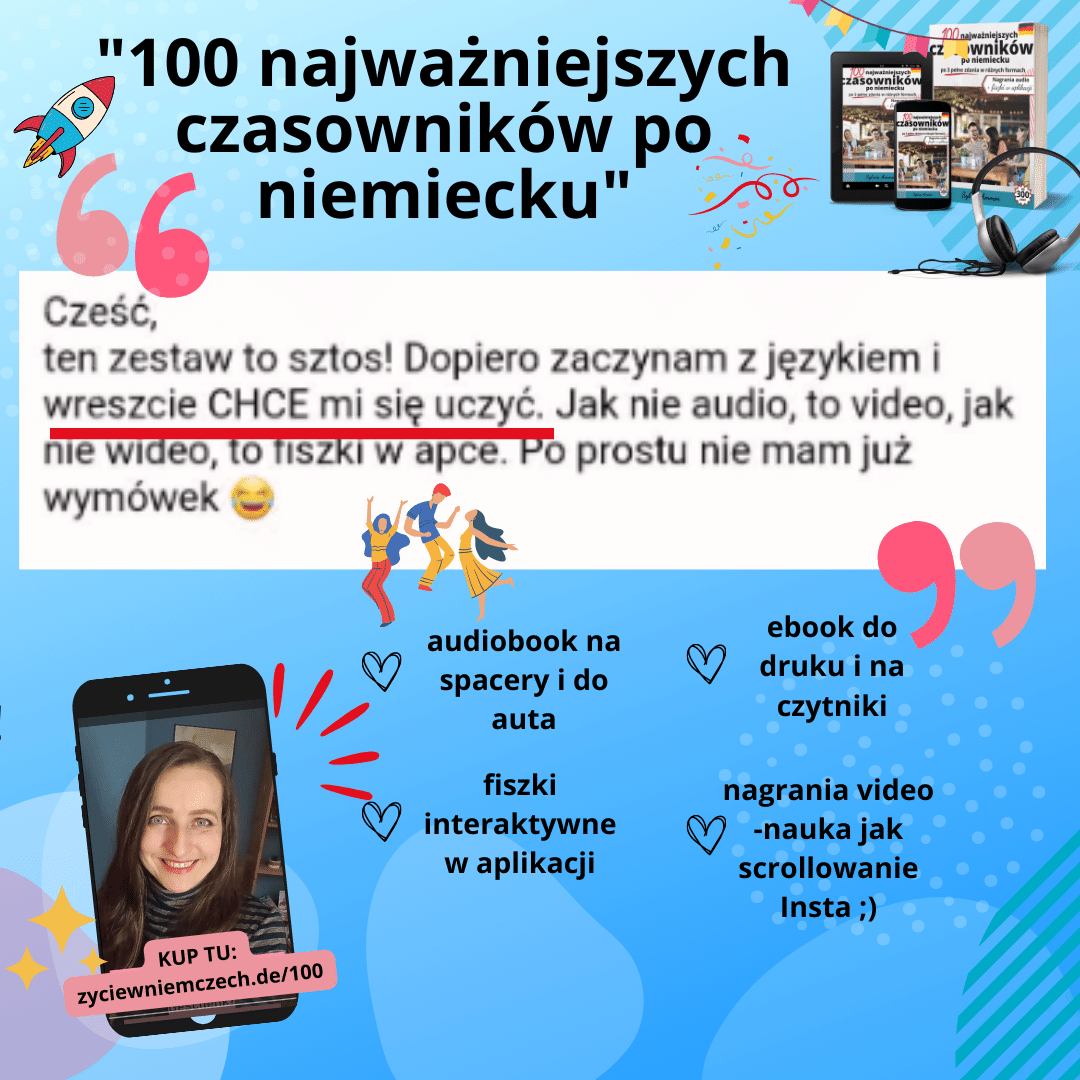 🍀 szybko i przyjemnie przyswoisz nie tylko absolutnie najważniejsze czasowniki, ale też poznasz 300 praktycznych zdań z częstymi konstrukcjami gramatycznymi i innymi częściami mowy!