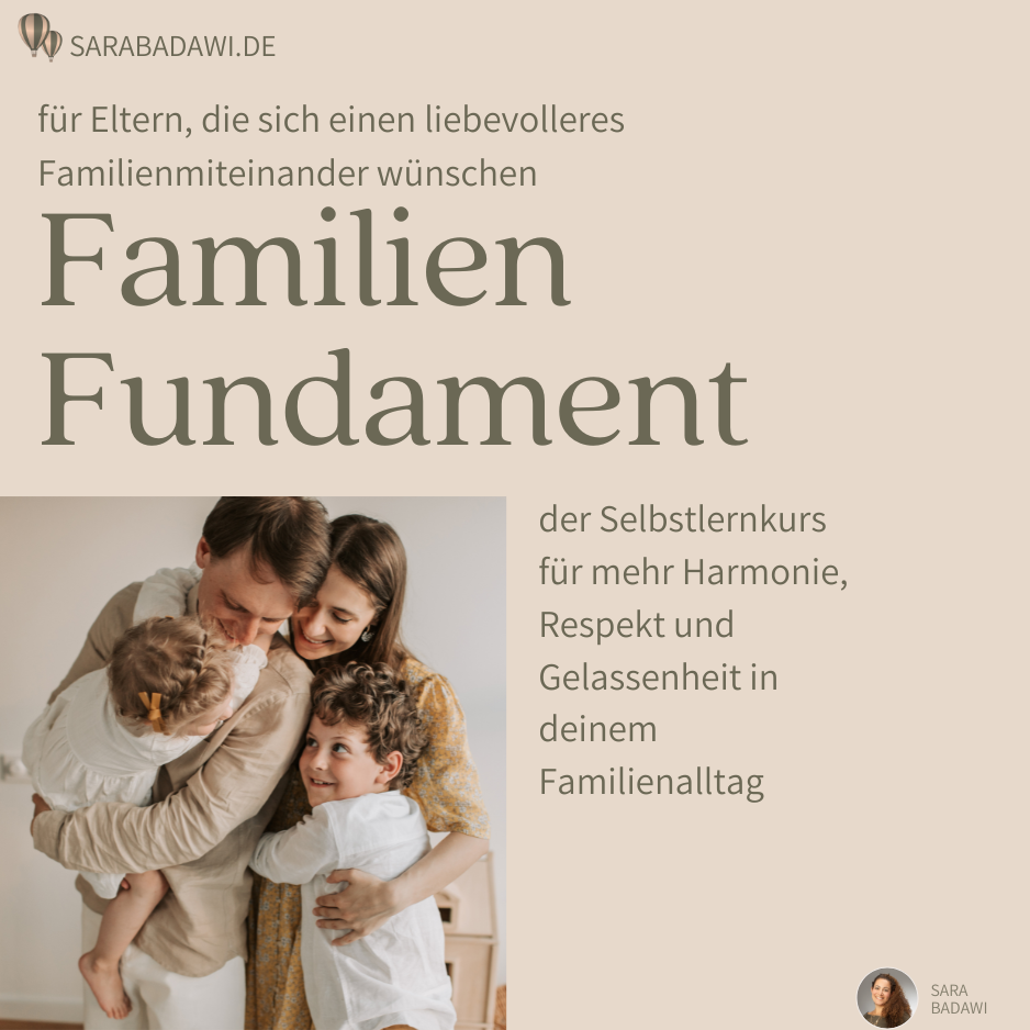 Mit meinem Selbstlernkurs ‘FamilienFundament’ lernst du die 4 essentiellen Grundpfeiler kennen, die jede Familie braucht, um eine stabile, respektvolle und harmonische Basis zu schaffen.