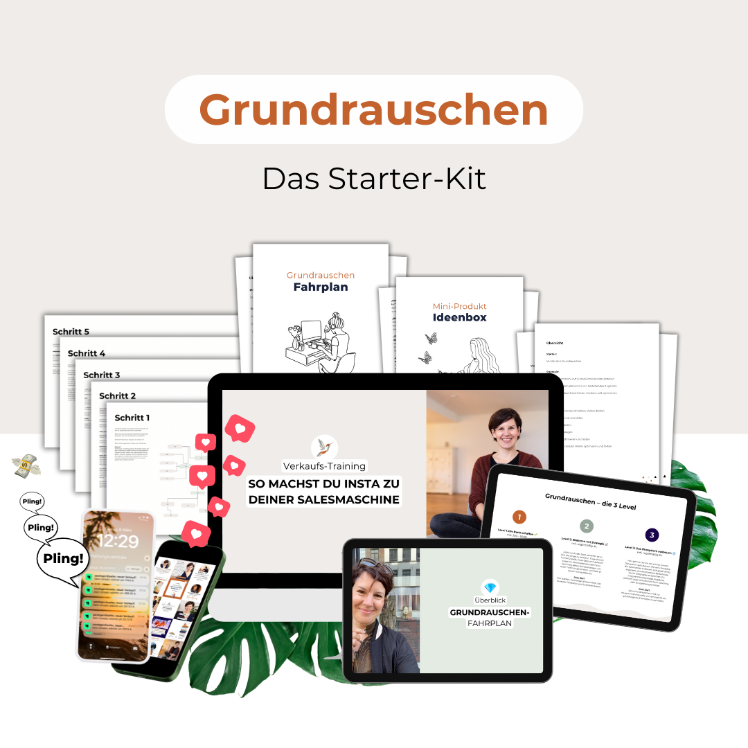 Das GRUNDRAUSCHEN-STARTER-KIT ist ein der Grundlagenkurs mit einer kompletten Schritt-für-Schritt-Anleitung, um dir deinen ersten Verkaufsprozess aufzusetzen, der auf Auto-Pilot läuft. Mit anderen Worten, es ist dein Ticket, das dich von A wie "Ich hab keine Ahnung, wie ich anfangen soll" bis Z wie "zusehen, wie dein erstes, kleines Grundrauschen reinkommt!" bringt.Course plan