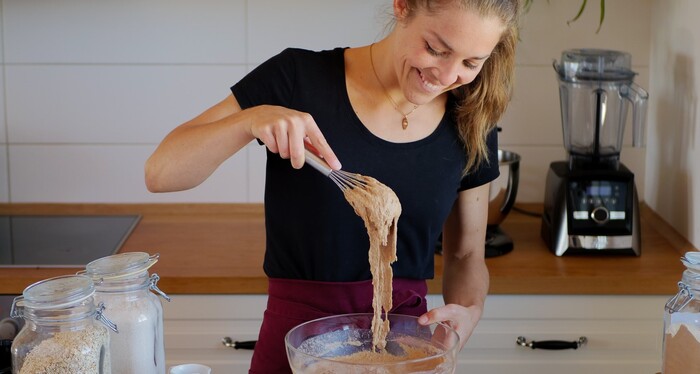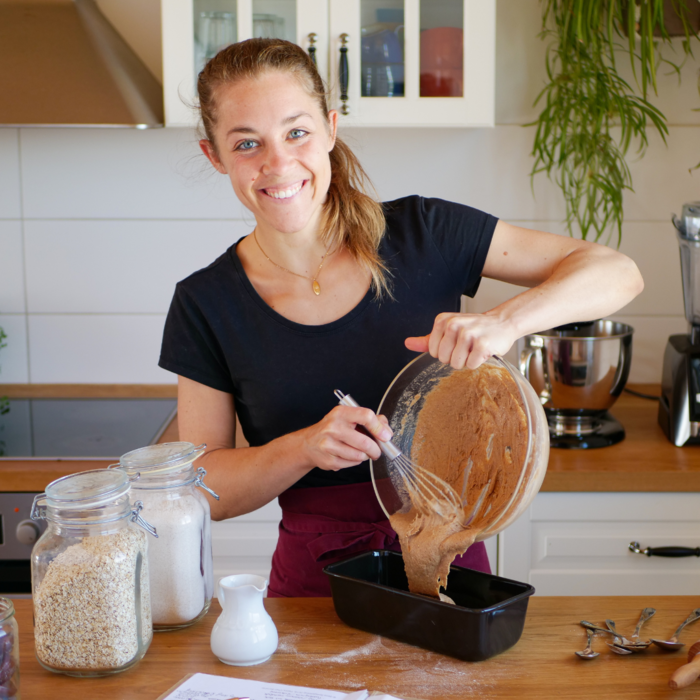Wenn ich von vollwertig spreche, dann meine ich, dass die Zutaten möglichst unverarbeitet sind und noch möglichst viele Nährstoffe und Ballaststoffe enthalten, weil gerade diese wohltuend für unseren Körper sind. In der Praxis heißt das, dass wir im Kurs statt raffiniertem Zucker > Trockenfrüchte verwenden, statt 405er Weizenmehl > Vollkornweizenmehl oder Vollkorndinkelmehl und statt Butter oder Öl verwenden wir Nüsse bzw. Nussmus.