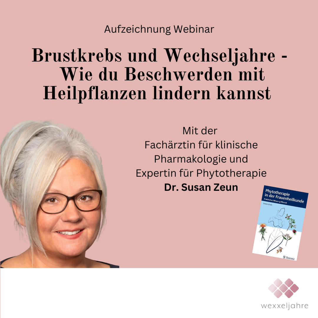 Wie kannst du Beschwerden in den Wechseljahren nach Brustkrebs behandeln? Eine Hormonersatztherapie ist in der Regel tabu, aber gerade wenn Frauen durch die Entfernung der Eierstöcke und/oder eine Antihormontherapie quasi von heute auf morgen in die Wechseljahre katapultiert werden, benötigen sie eine wirksame Behandlung. Was bringen pflanzliche Arzneimittel oder Nahrungsergänzungsmittel, und welche Möglichkeiten gibt es im Bereich der individuellen Pflanzentherapie? Antworten auf diese und viele weitere Fragen gab es in unserem Webinar mit Dr. Susan Zeun, Fachärztin für klinische Pharmakologie und Expertin für die Phytotherapie in der Frauenheilkunde. Sie ist auch Autorin der Bücher „Phytotherapie in der Frauenheilkunde“ und „Schlüpferakademie“.