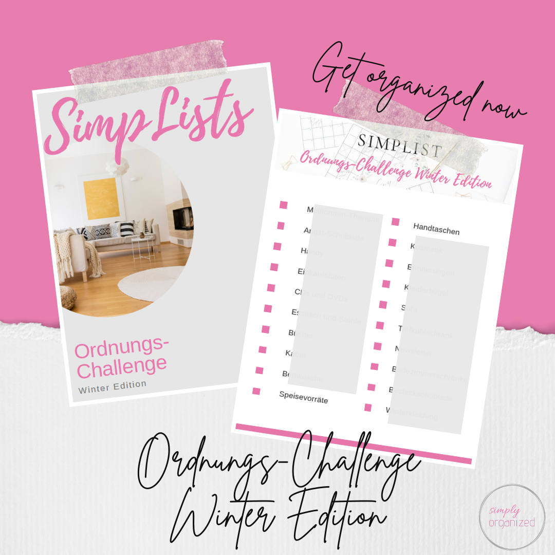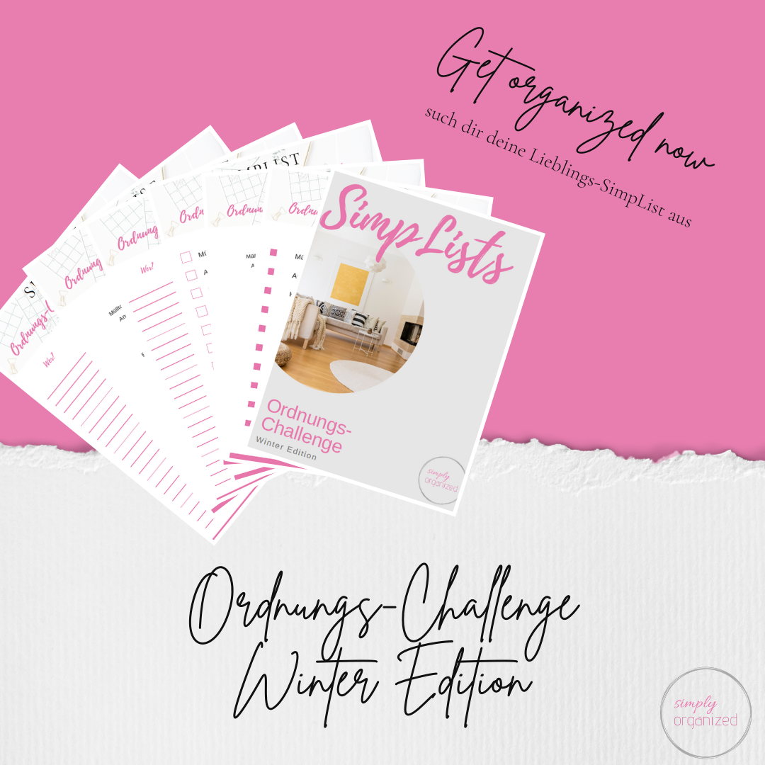 Du findest in der „Ordnungs-Challenge Winter Edition“ jene Punkte die gerade in den Wintermonaten wunderbar zu erledigen sind, mit vielen wertvollen Hinweisen, Tipps und Tricks, tollen Anleitungen und sechs schön designten Checklisten zur Auswahl, wovon du dir deine Lieblings-SimpList einrahmen kannst. Diesmal sind sogar Videoanleitungen zu gewissen Punkten inkludiert.