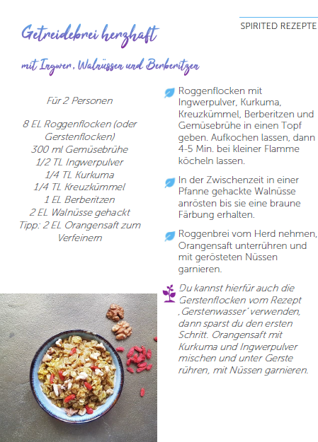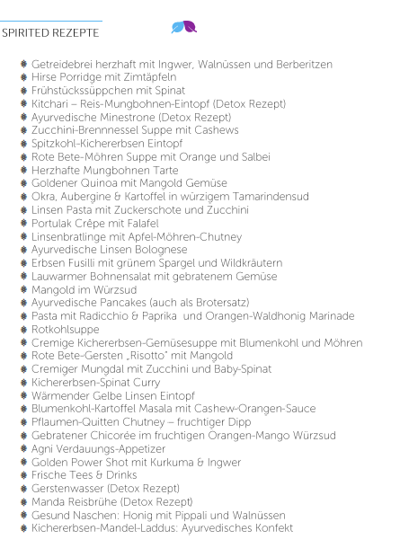 - Vegetarisch, ayurvedisch, mediterran inspiriert (vegan oder mit veganer Alternative, meist glutenfrei)