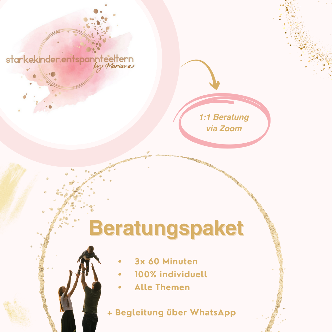 Du wünschst dir Unterstützung in deinem Elternalltag? Es kommt häufiger zu Situationen, in denen du nicht weiter weißt und dir eine Handlungsmöglichkeit fehlt? Oder du möchtest an dir arbeiten, weil du dich zunehmend ausgelaugt fühlst? Dann ist das Beratungspaket genau richtig für dich. Zusätzlich zu den drei Beratungen über Zoom stehe ich dir jederzeit über WhatsApp zur Verfügung, sodass du mir in Akutsituationen schreiben kannst. Im Anschluss an die Beratungen bekommst du auch eine PDF-Datei von mir mit den wichtigsten Inhalten und je nachdem Übungen/ Vorlagen.