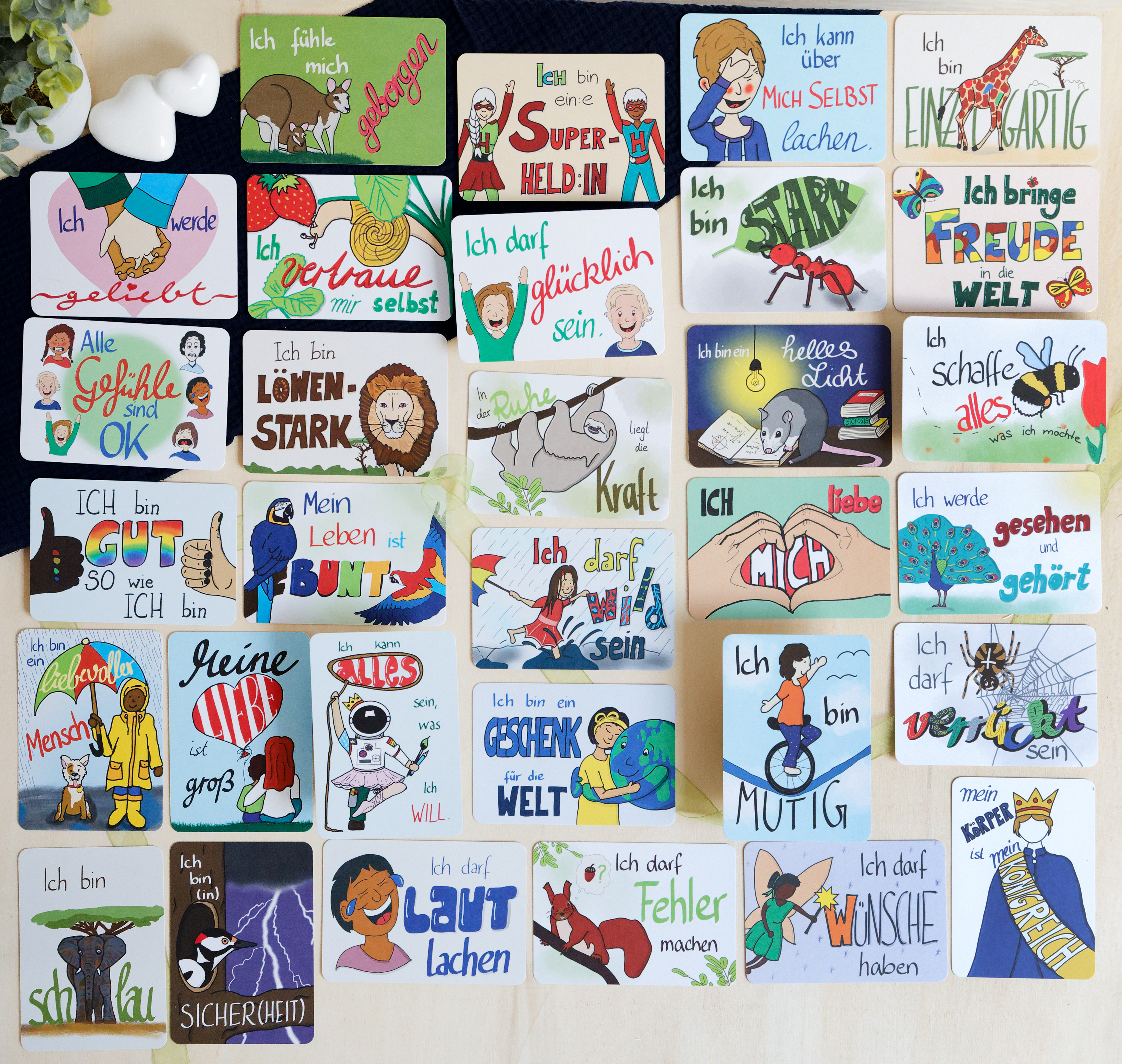 Euer Kind darf jeden Abend eine Karte ziehen und ihr lest diese laut vor. Euer Kind darf dann die Aussage dreimal laut vorsagen. Durch die tollen Bilder und das sich selbst Vorsagen vor dem Schlafengehen, setzen sich die Inhalte ins Unterbewusstsein und stärken Euer Kind von innen heraus.