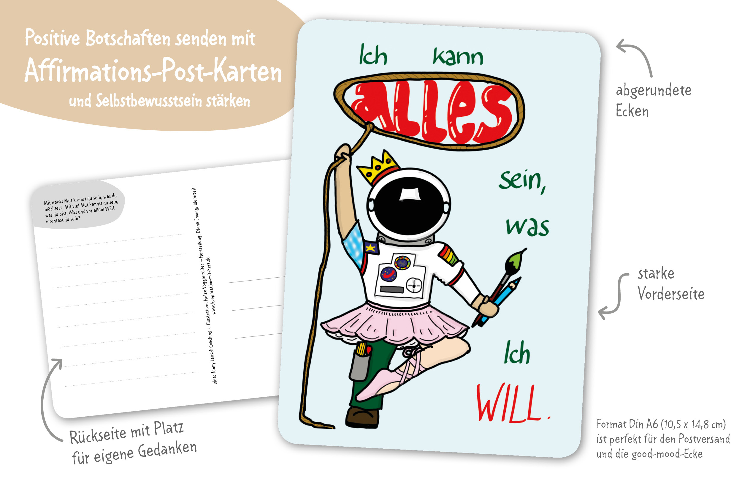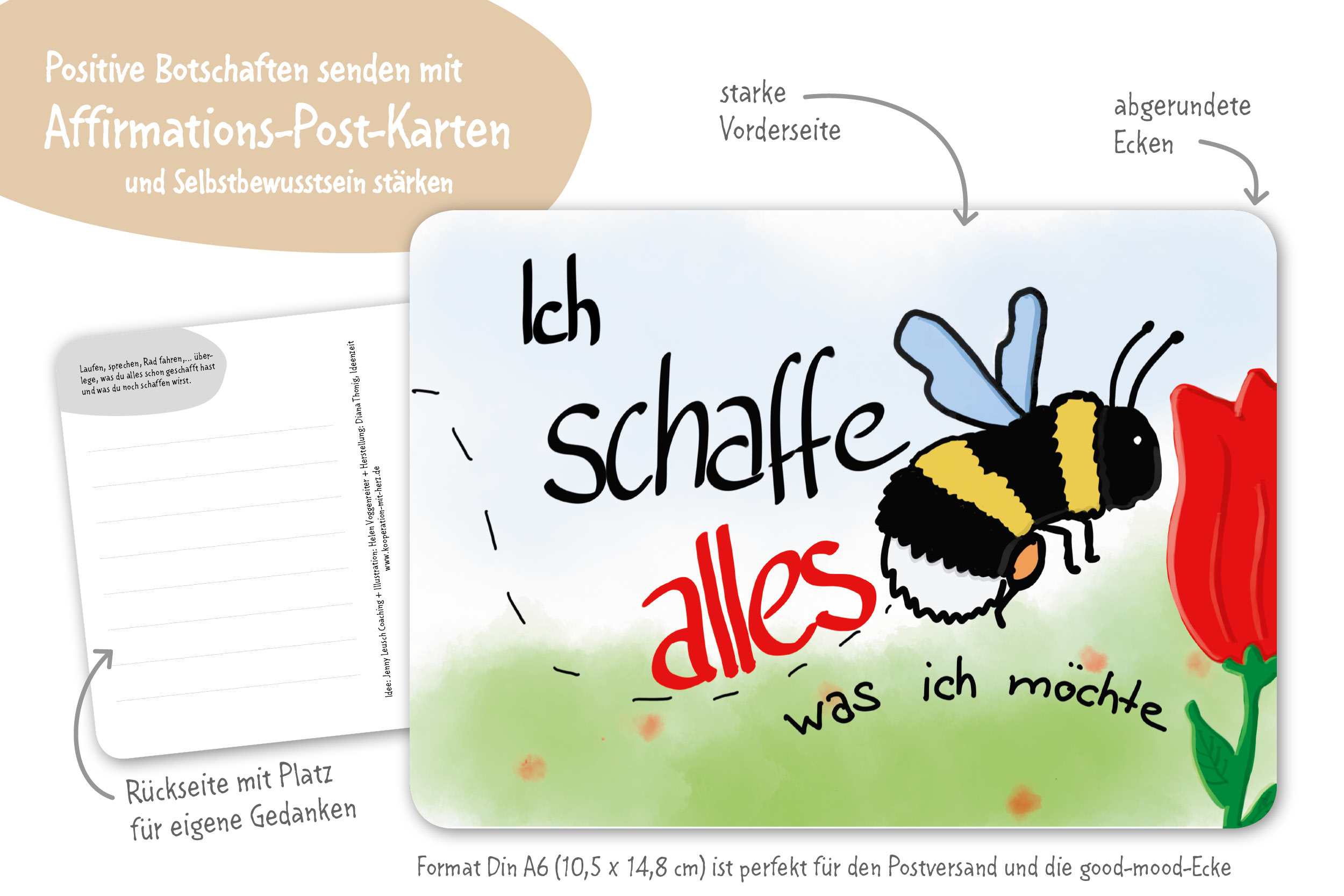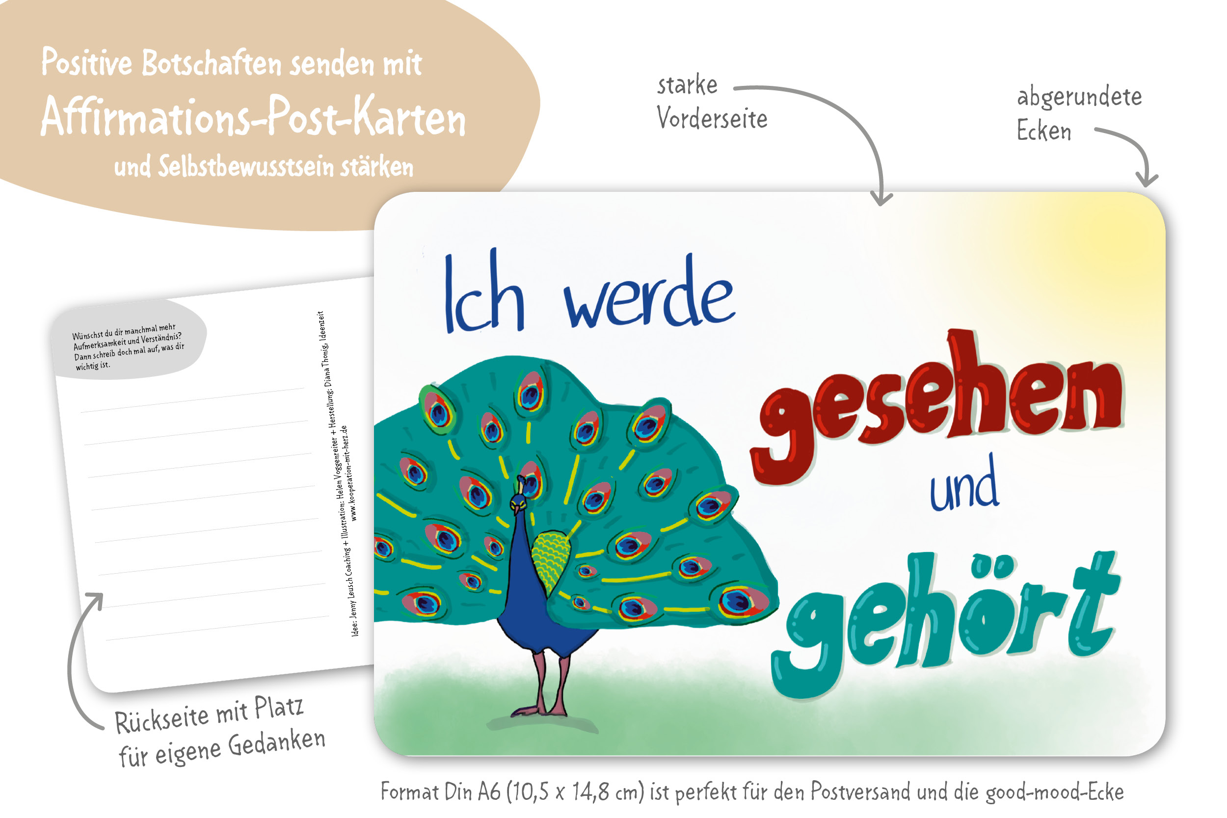 31 haptisch hochwertige Affirmationskarten, die auch als Postkarte verwendet werden können. Auf der Postkartenseite findet ihr auch jeweils tolle Fragen oder Aufgaben, die die Inhalte nochmal verstärken und zu wertvollen, gemeinsamen Gesprächen genutzt werden können.
