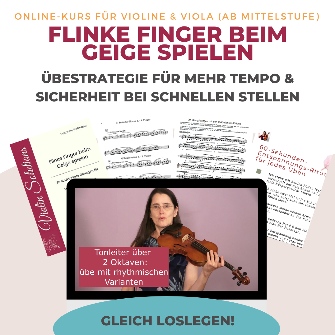 💬 „Der Flinke-Finger-Kurs war sehr hilfreich für die Geläufigkeit auf der Geige. Susanne erstellt dazu sinnvolle Materialien, Übungen, Etüden mit Videos, in denen sie alles erklärt. Das ist über den Kurs hinaus und für das Selbststudium super."