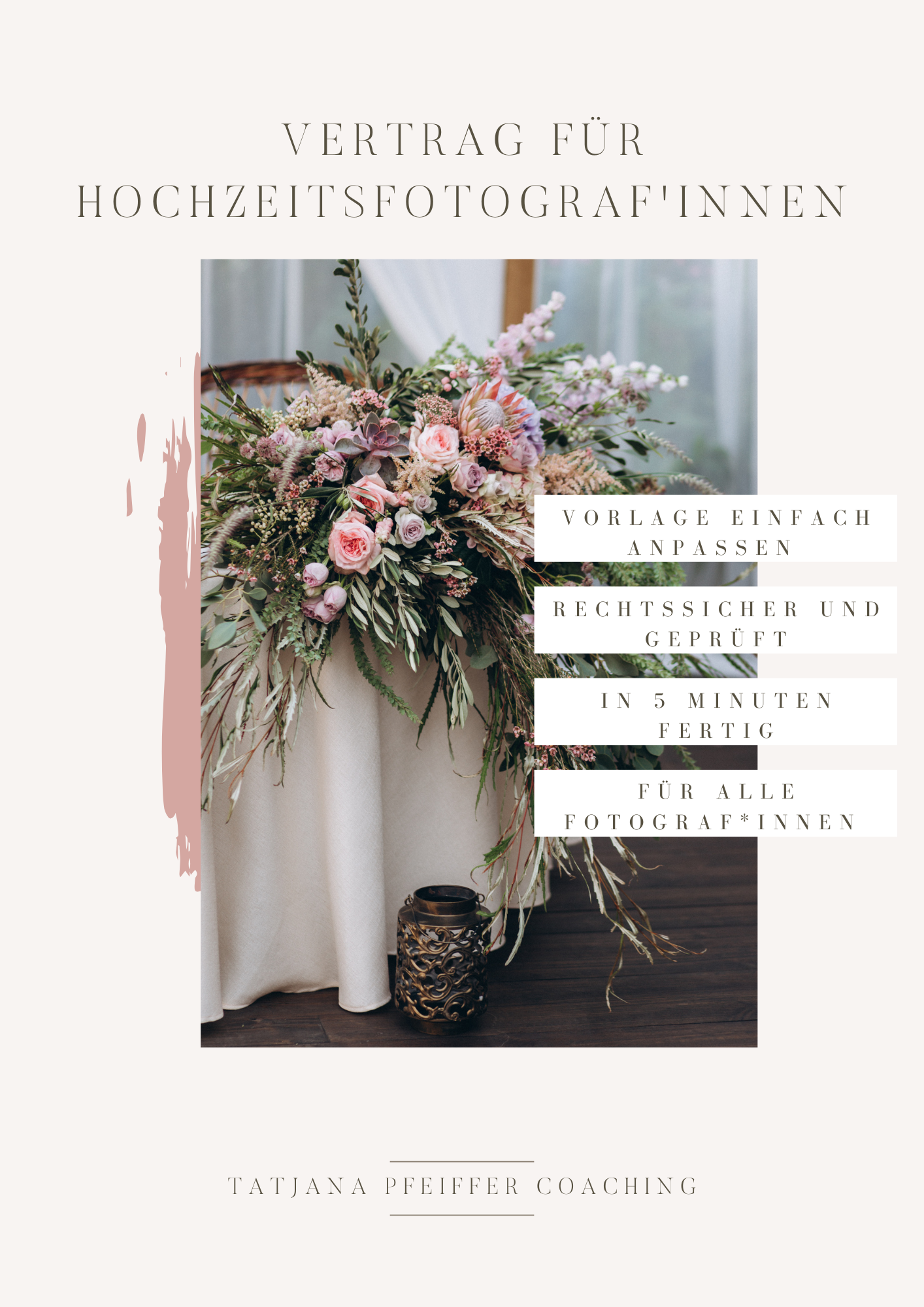 Hier bekommst du deinen Hochzeitsvertrag. Du kannst ihn individuell anpassen und so gestalten, dass er zu dir passt.Somit hast du einen rechtssicheren und aktuellen Vertrag, den du deinen Brautpaaren zusenden kannst.