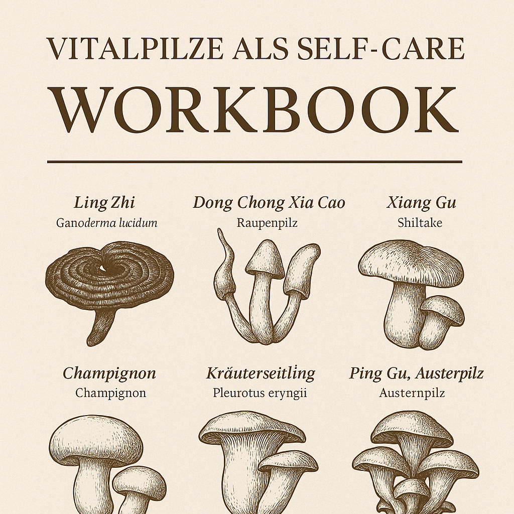 Entdecke die kraftvolle Verbindung aus Traditioneller Chinesischer Medizin (TCM), Vitalpilzen und hochwertiger Self-Care. Dieses stilvoll gestaltete Workbook vermittelt dir fundiertes Wissen über Wirkung, Inhaltsstoffe und Anwendung von Vitalpilzen wie Ganoderma (Reishi), Cordyceps, Shiitake, Tremella und vielen mehr.