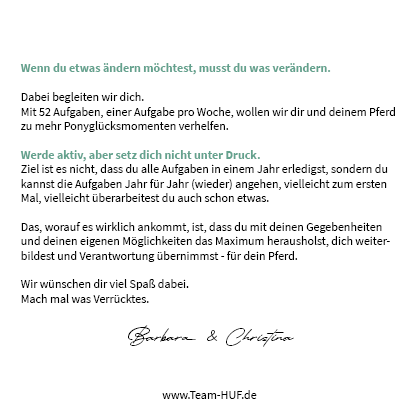 Mit 52 Aufgaben, einer Aufgabe pro Woche, wollen wir dir und deinem Pferd zu mehr Ponyglücksmomenten verhelfen.