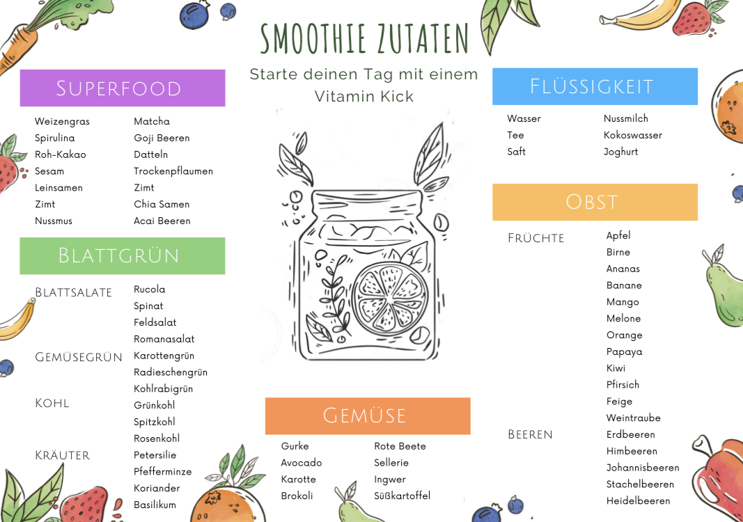 Diese Zutaten Übersicht für Smoothies hilft dir jeden Tag etwas Abwechslung und Kreativität in deinen Mixer zu bringen.