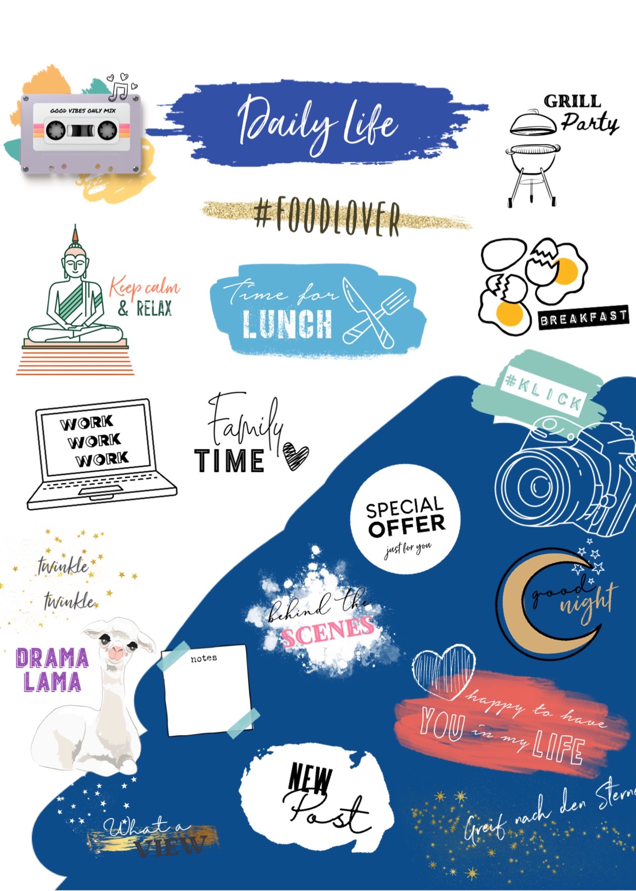 Im Daily Life Paket sind über 100 Sticker enthalten, viele davon in 2 Varianten für helle und dunkle Hintergründe. Z.B.: