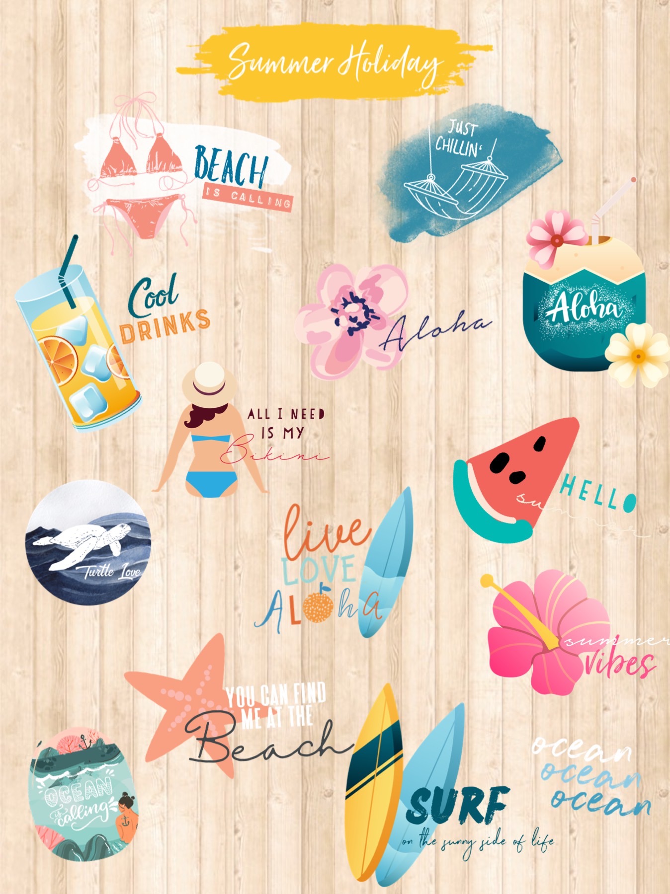 Im Summer Holiday Paket sind über 35 verschiedene Sticker enthalten, viele davon in 2 Varianten für helle und dunkle Hintergründe: