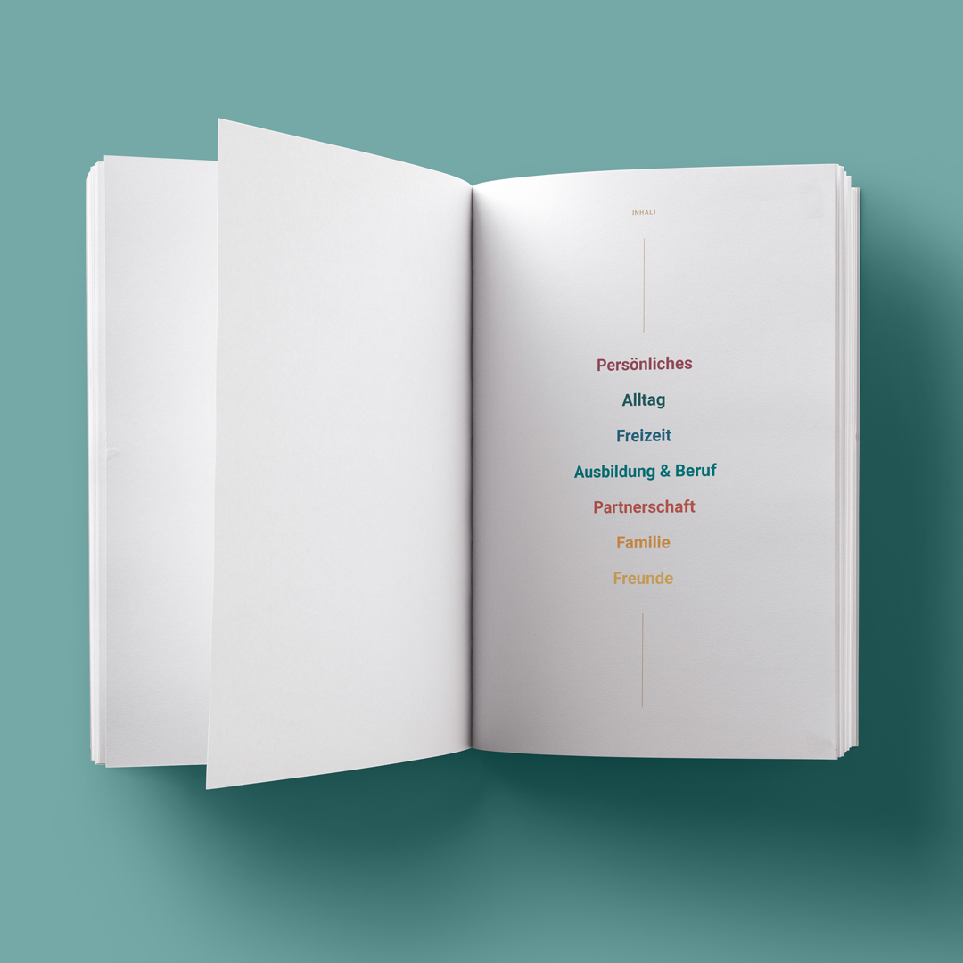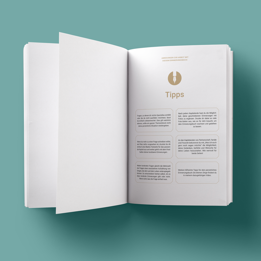 Das Erinnerungsbuch Die kleinen Dinge lotst dich durchdacht durch alle Lebensbereiche, in denen sich Erinnerungen an dein gelebtes Leben finden können. Dadurch schenkt es dir Halt und Struktur, aber immer auch ausreichend Freiraum. Freiraum nämlich, um aus dem Erinnerungsbuch deinen ganz persönlichen, einzigartigen Erinnerungsschatz entstehen zu lassen.