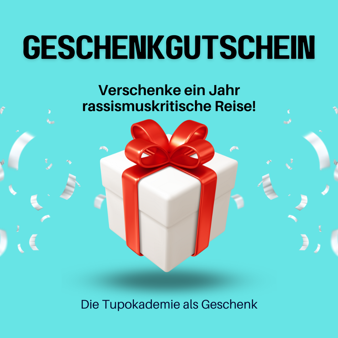 Verschenke ein ganzes Jahr der persönlichen und gemeinschaftlichen Weiterentwicklung! Mit diesem Gutschein für eine 12-monatige Mitgliedschaft in der Tupokademie. Die Community begleitest du jemanden auf einer tiefgehenden Reise zu mehr rassismuskritischem Denken und Handeln.