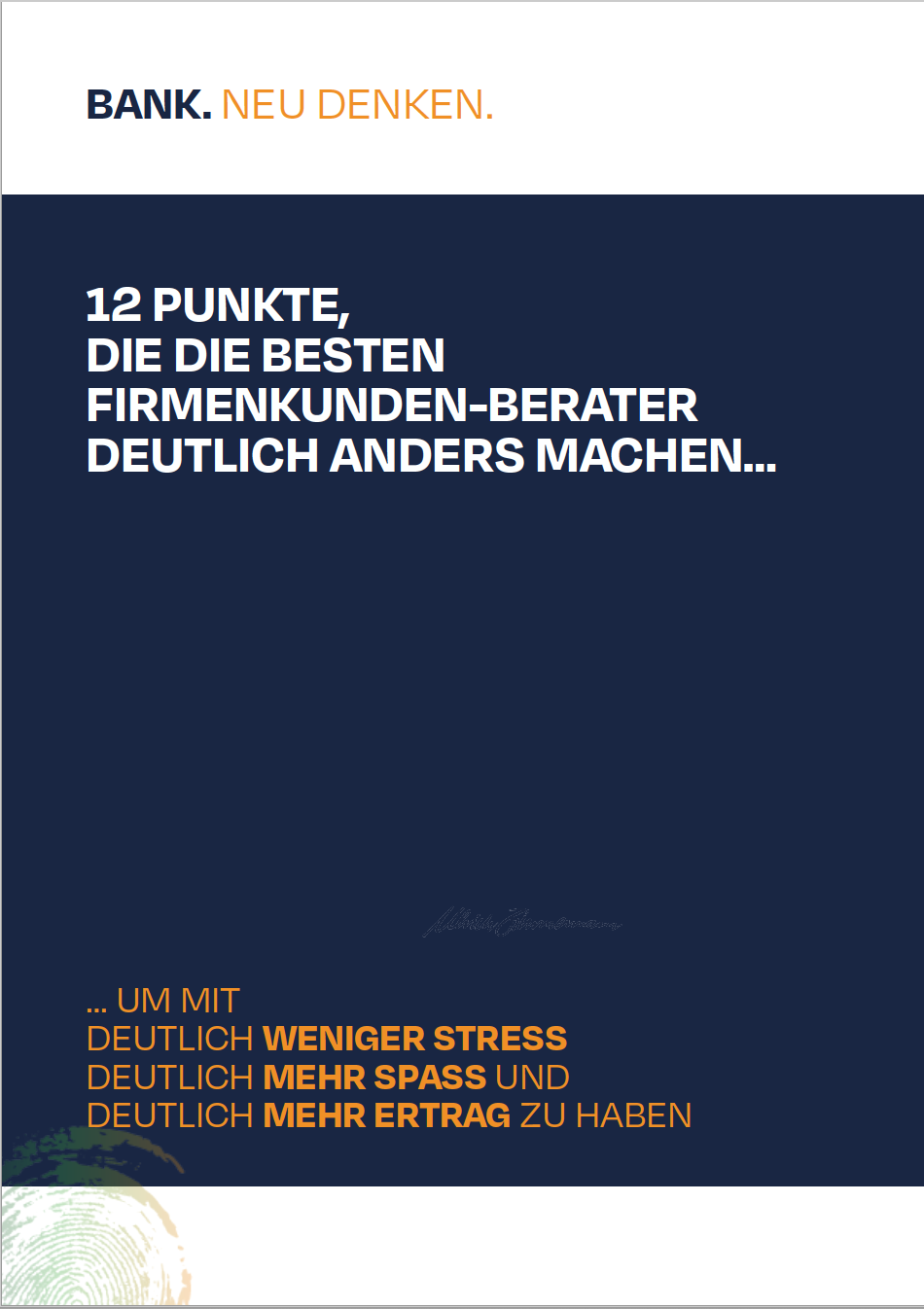 In diesem 40seitigen WorkBook bekommst du in 12 Kapiteln extrem praxisbewährte Tipps, mit denen du als FirmenkundenBerater einer regionalen Bank einen völlig anderen Drive in deine KundenBeziehungen bekommst.