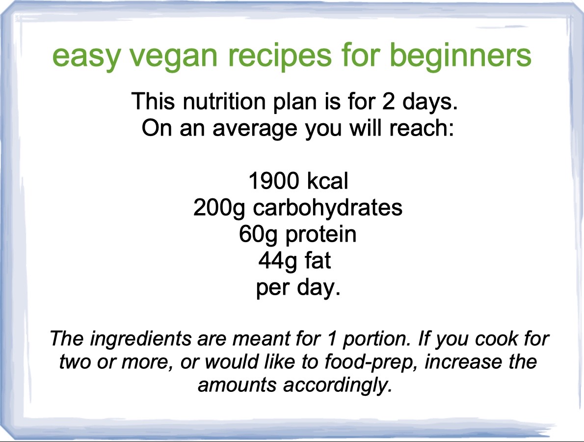 This nutrition plan is for everyone who would like to try out the vegan diet or recently started the vegan journey and is looking for a balanced out plan with healthy, easy recipes. With approximately 1900 kcal daily, you will cover your daily needed carbohydrates, protein and fat.