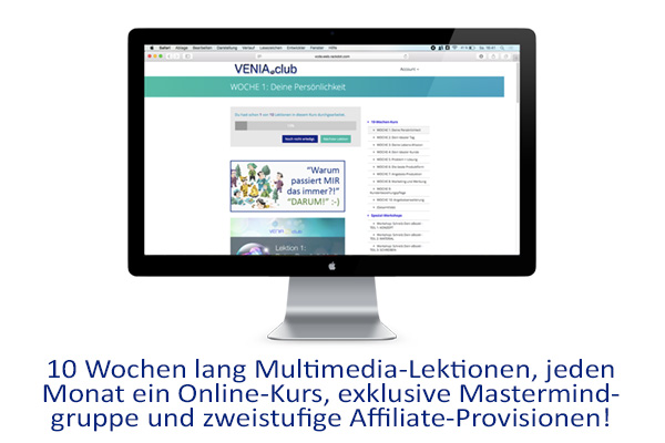 Wöchentliche Videolektionen und Workbook-Aufgaben, dazu Intensiv-Workshops zu einzelnen Fähigkeiten und die exklusive Mastermind-Gruppe … der VENIAclub ist ein in dieser Form absolut einzigartiges Weiterbildungs- und Selbstentwicklungsangebot!