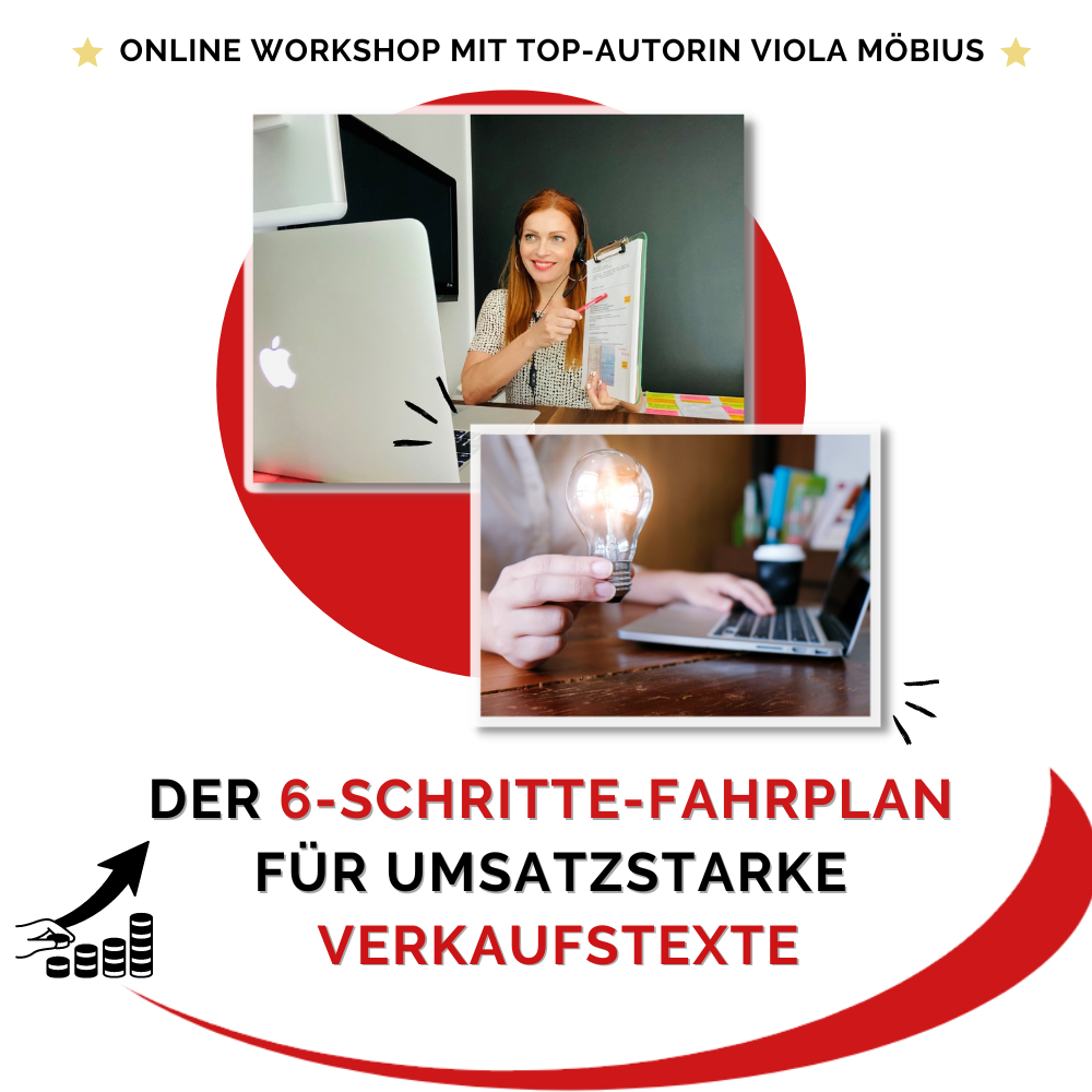 ✔️ den 6-Schritte-Fahrplan – was ein umsatzstarker Verkaufstexte braucht und wie Kunden mithilfe eines speziellen Tools verstehen, dass du besser & sympathischer bist, als die Konkurrenz.
