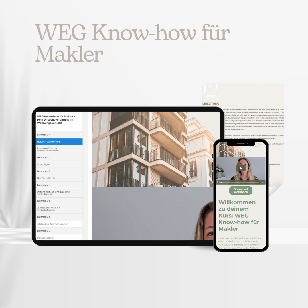 Mit diesem Kurs bekommst du genau das WEG-Wissen, das du brauchst – nicht mehr und nicht weniger. So kannst du nicht nur Wohnungen verkaufen, sondern deine Kunden mit echtem Wissen begeistern und dich als professioneller Ansprechpartner positionieren.