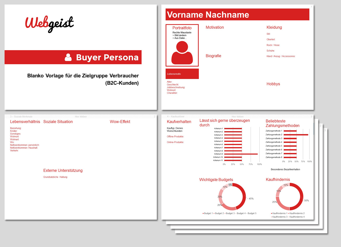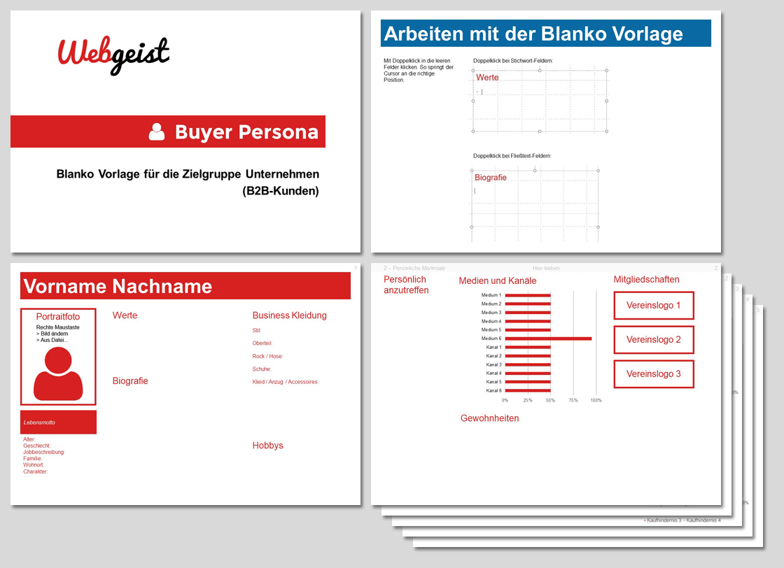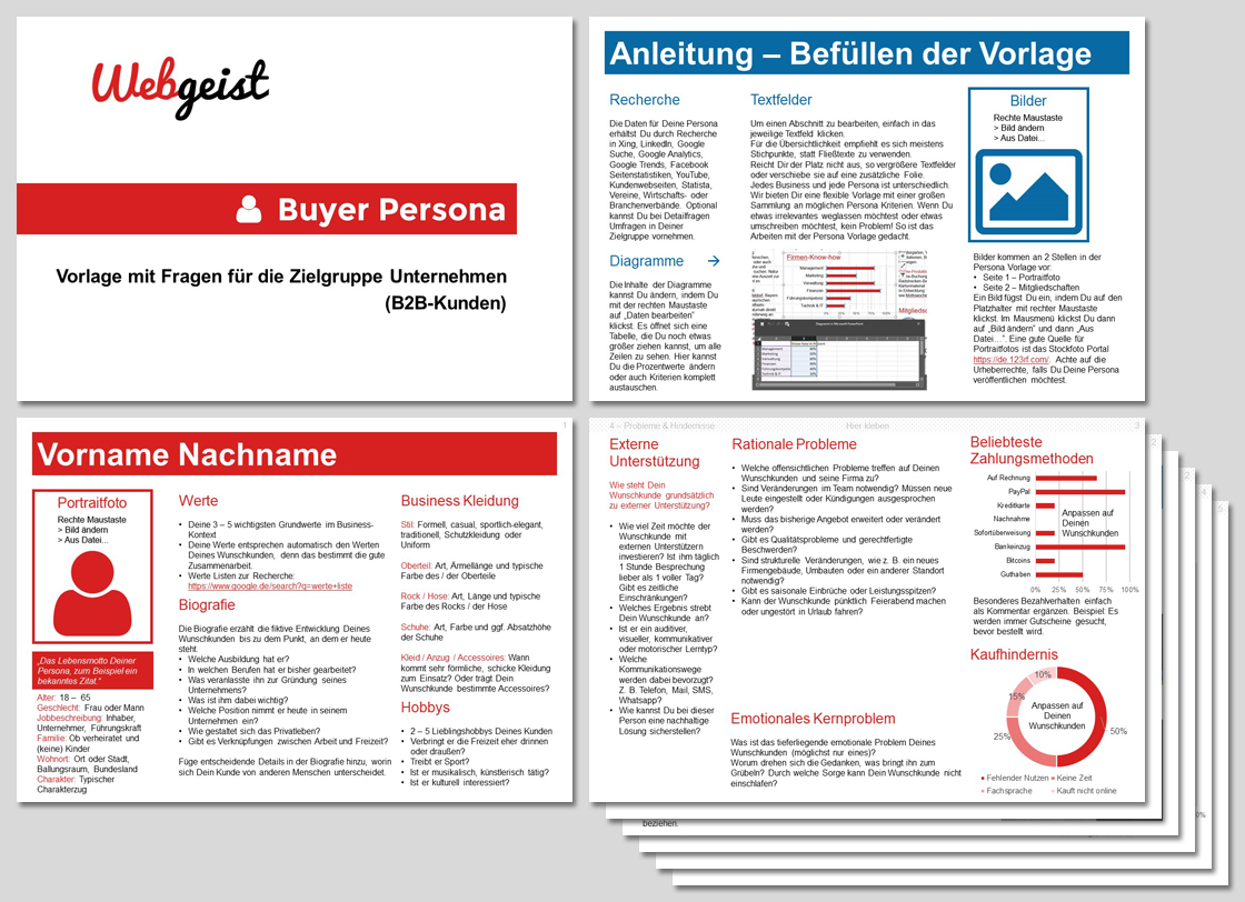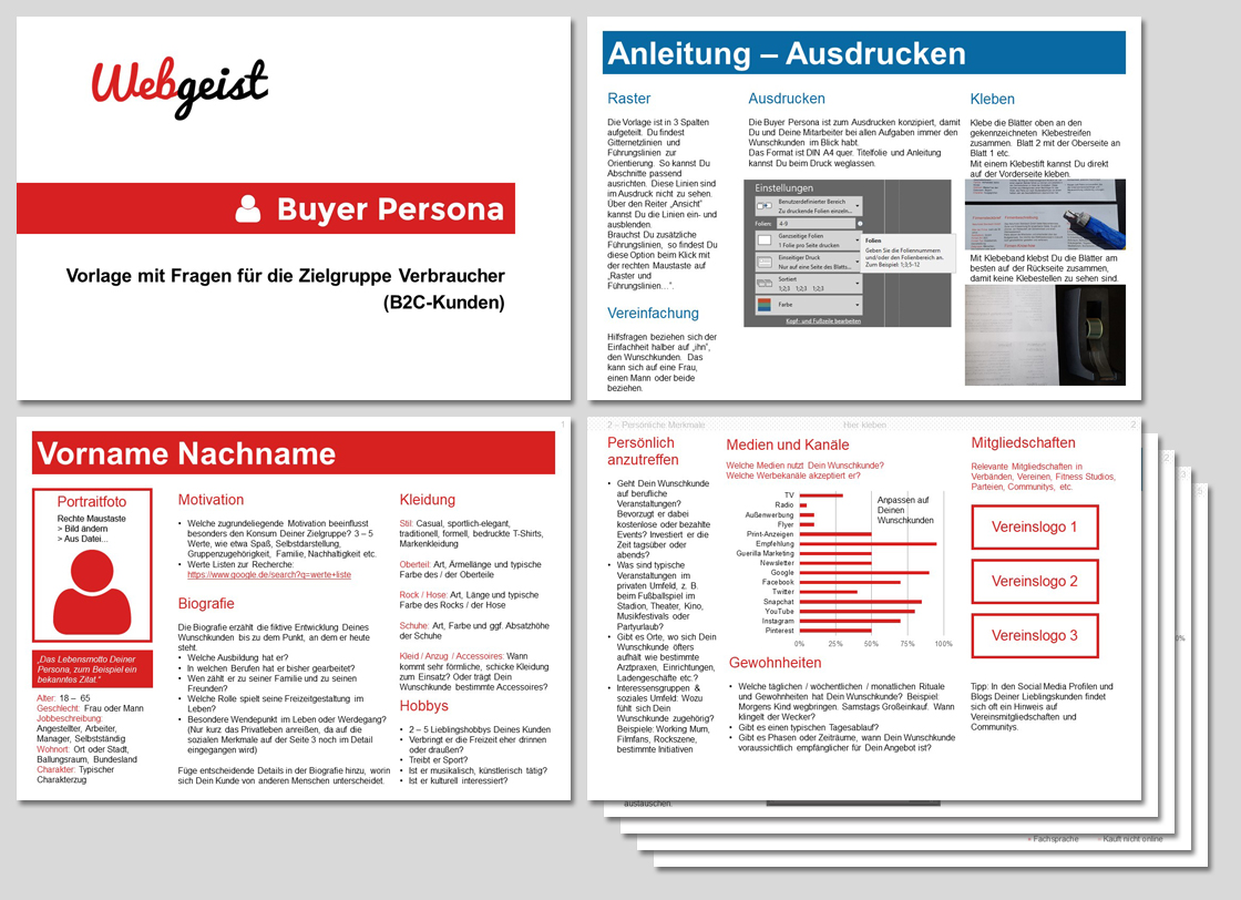 - Die Persona Vorlage ist durch zwei Persona-Varianten sowohl für Unternehmen (= B2B-Kunden), wie auch für Verbraucher (= B2C-Kunden) geeignet