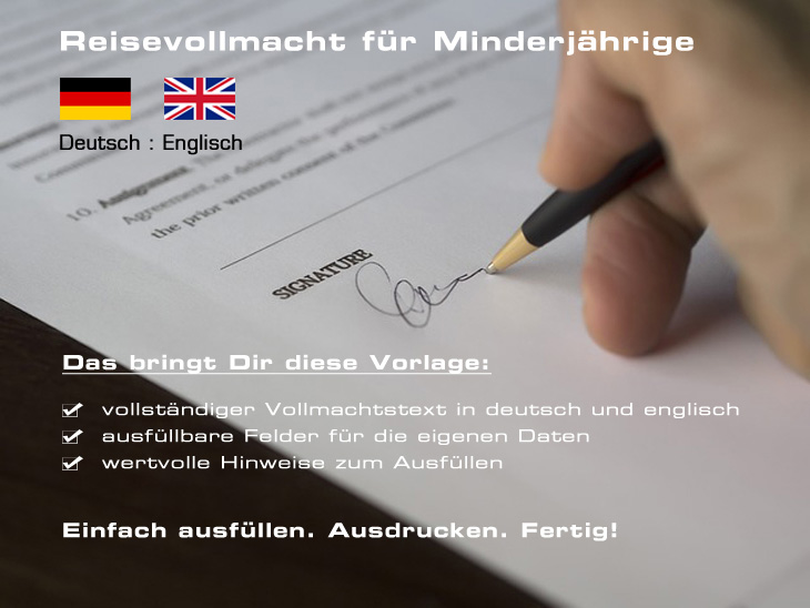 Unsere Vorlage „Reisevollmacht für Minderjährige“ in deutsch/englisch macht auch für dein Kind das Reisen sicherer.